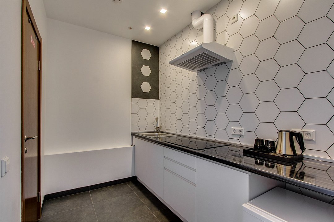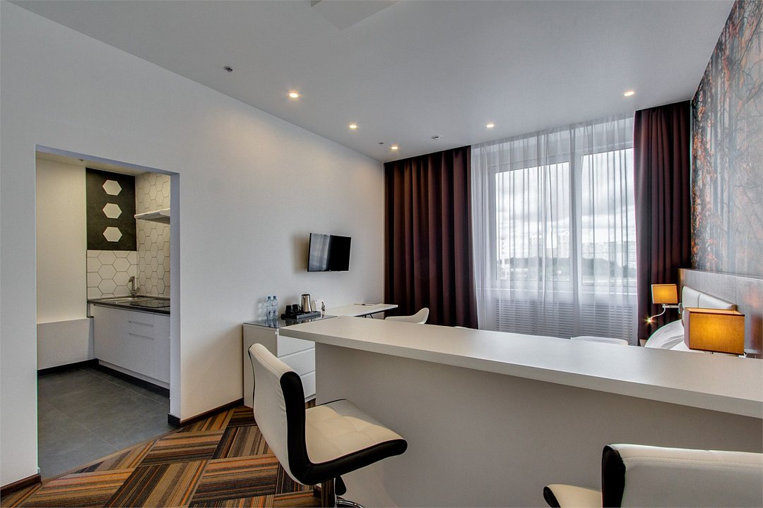 Большой современный номер с полноценной кухней и обеденной зоной.Услуги и удобства