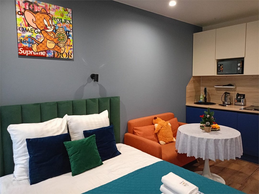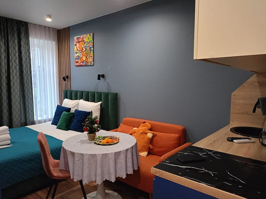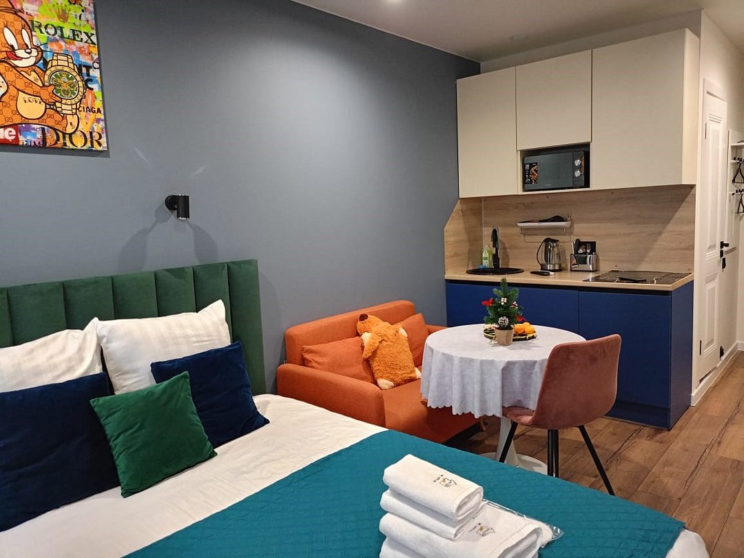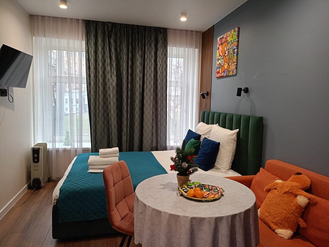 телевизор, Wi-Fi, кондиционер, фен, плита для приготовления пищи, микроволновая печь, утюг, ванная комната, водонагреватель, тапочки, гигиенические средства, двуспальная кровать, гладильная доска, диван, тумбы, стулья, вешалки, зеркало, мебельный гарнитур, чайный набор, набор посуды, чайник, раковина, питьевая вода, обеденная зона, отопление, душ, вид на город, кухонная посуда, стаканы, кухонная утварь, столовые приборы, туалетные средства, туалет, диван-кровать, мини-холодильник, мини-кухня, номер для некурящих, набор для приготовления чая и кофе, мыло, затемняющая штора, прачечная (за дополнительную плату), без питомцевВ апартаментах