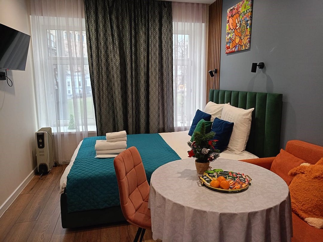 телевизор, Wi-Fi, кондиционер, фен, плита для приготовления пищи, микроволновая печь, утюг, ванная комната, водонагреватель, тапочки, гигиенические средства, двуспальная кровать, гладильная доска, диван, тумбы, стулья, вешалки, зеркало, мебельный гарнитур, чайный набор, набор посуды, чайник, раковина, питьевая вода, обеденная зона, отопление, душ, вид на город, кухонная посуда, стаканы, кухонная утварь, столовые приборы, туалетные средства, туалет, мини-холодильник, мини-кухня, номер для некурящих, набор для приготовления чая и кофе, мыло, затемняющая штора, прачечная (за дополнительную плату), без питомцевВ апартаментах