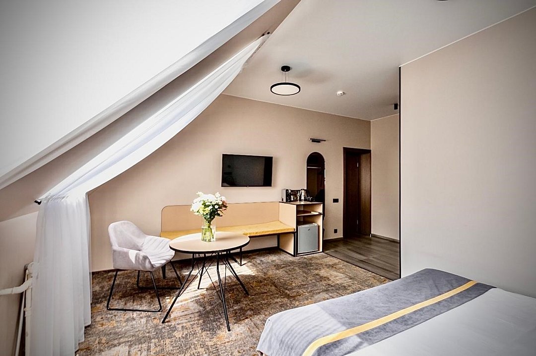 Wi-Fi, кондиционер, светильник, фен, электронные замки, халаты, банные полотенца, тапочки, гигиенические средства, косметические средства, кровать «King size», шкаф для одежды, вешалки, зеркало, чайный набор, сейф, чайник, раковина, косметическое зеркало, питьевая вода, ковровое покрытие, отопление, душ, кулер на этаже, кресло, высокие потолки, стаканы, стул, стол, туалетные средства, туалет, цифровое тв, телевизор с плоским экраном, мини-холодильник, мансардные окна, номер для некурящих, чайная станцияВ гостиничном номере