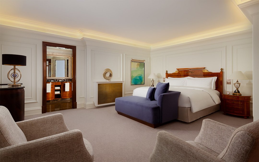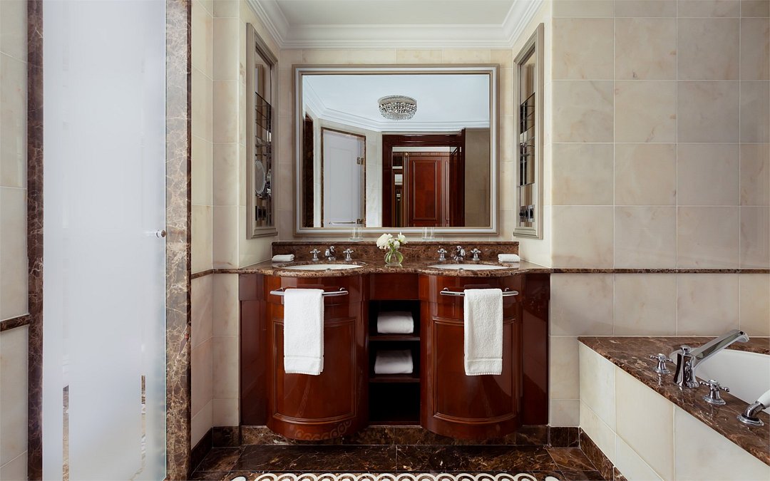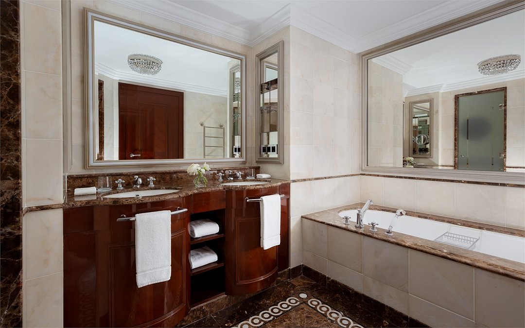 Угловые двухкомнатные люксы Карлтон открывают вид на исторический центр города. В отдельной гостиной находится просторная уютная зона, располагающая для отдыха. Стильные подушки украшают большой комфортный диван и кресла, а боковые столики декорированы зеленым мрамором. Выполненный на заказ ковер объединяет все компоненты гостиной в единое целое, а архитектурная лепнина придает комнате большую выразительность. Овальный стол с узором в технике маркетри и хрустальная люстра над ним приглашают к теплому общению. С другой стороны расположился рабочий стол – элегантное сочетание дерева, латуни и кожи. Спальня с мебелью, созданной по авторскому проекту, переходит в просторную гардеробную. В ванной комнате, отделанной благородным мрамором, пространство визуально увеличивается за счет больших зеркал, а освещение тщательно продумано для комфорта гостей. Кроме того, гости люкса Карлтон получают доступ в Клубную гостиную The Carlton Club с эксклюзивными привилегиями.Услуги и удобства