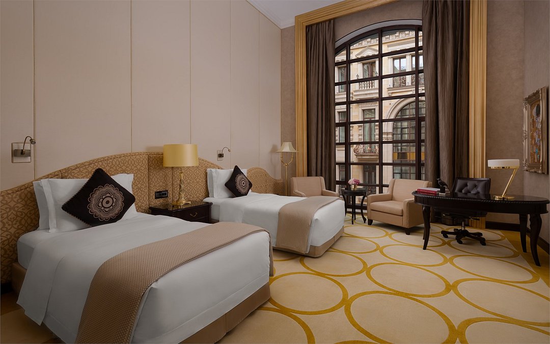 Просторная спальня с двумя односпальными кроватями, из окон которой открывается потрясающий вид на Лубянскую площадь, Никольскую улицу или живописный Итальянский дворик. Интерьер зоны отдыха и спальной зоны продуман до мельчайших деталей, а изготовленная на заказ мебель подчеркивает стиль и эстетику номера. В ванной комнате предусмотрены как ванна, так и душевая кабина, для вашего максимального комфорта.Услуги и удобства