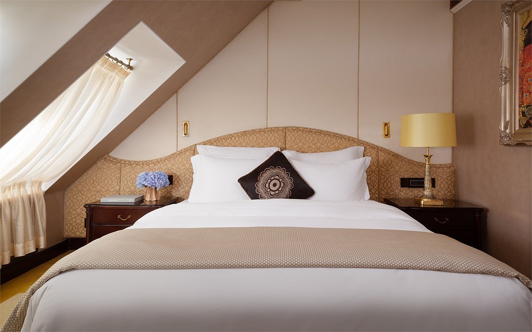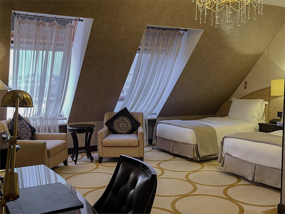 телевизор, кабельное телевидение, Wi-Fi, интернет, телефон, кондиционер, светильник, настольные лампы, фен, электронные замки, кофемашина, утюг, ванная комната, ванна, биде, теплый пол, банные принадлежности, халаты, банные полотенца, тапочки, косметические средства, кровать «King size», диван, шкаф для одежды, журнальный столик, письменный стол, зеркало, мини-бар, обслуживание номеров, сейф, чайник, ковровое покрытие, душ, вид на город, кресло, стул, тумба, туалетные средства, туалет, мансардные окна, номер для некурящих, бутилированная водаВ гостиничном номере