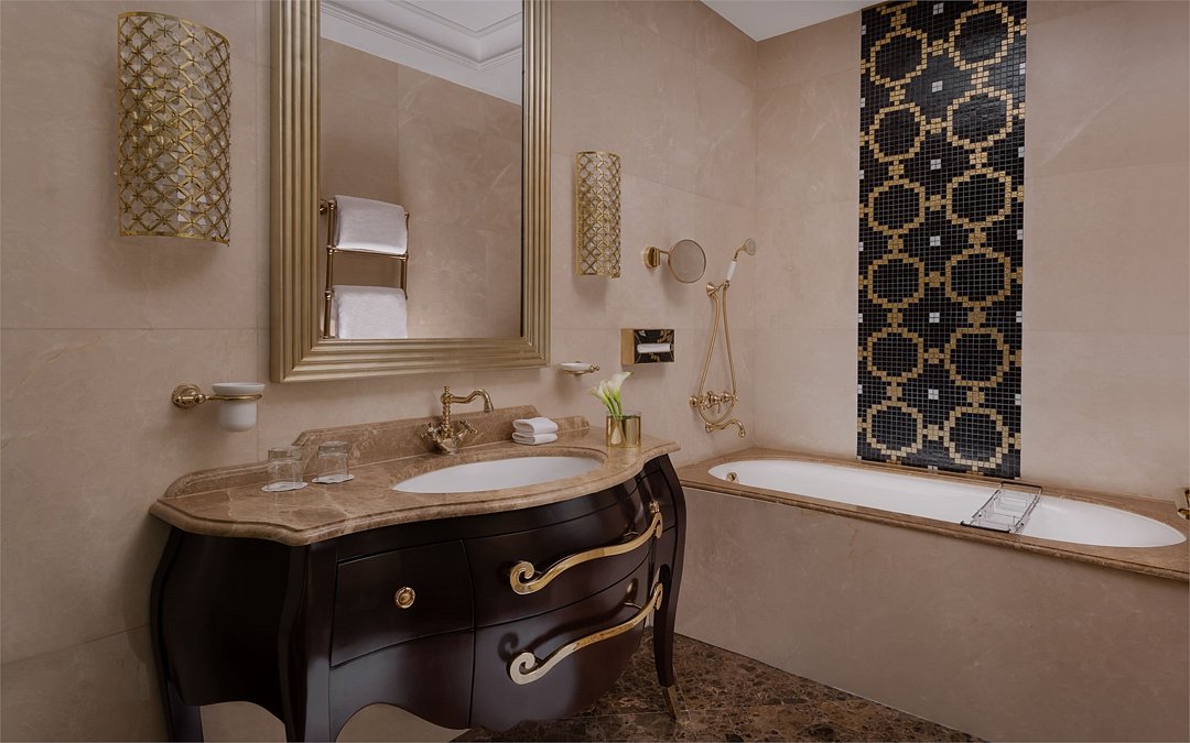 телевизор, интерактивное телевидение, Wi-Fi, интернет, телефон, кондиционер, светильник, настольные лампы, фен, будильник, электронные замки, кофемашина, утюг, радио, ванная комната, ванна, биде, теплый пол, халаты, банные полотенца, тапочки, косметические средства, кровать «King size», диван, шкаф для одежды, журнальный столик, письменный стол, зеркало, две комнаты, мини-бар, чайный набор, обслуживание номеров, сейф, чайник, раковина, гостиная зона, ковровое покрытие, душ, вид на город, кресло, вид во двор, стул, тумба, туалетные средства, туалет, цифровое тв, номер для некурящих, фанкойл, usb порт, бутилированная водаВ гостиничном номере