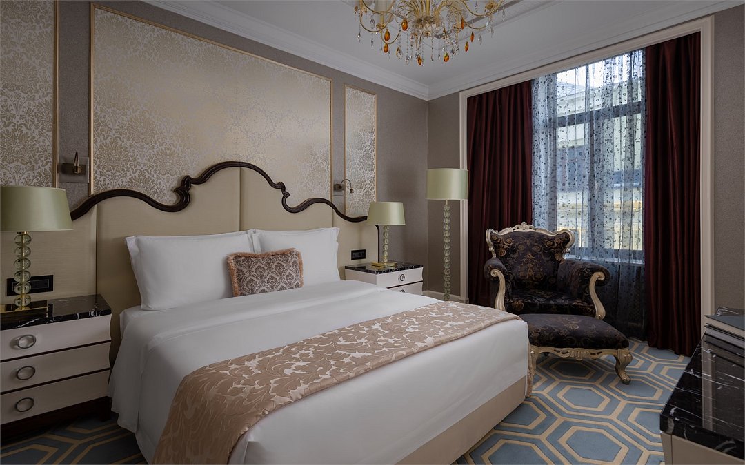 Номер Делюкс с кроватью King - это идеальное сочетание элегантности и уюта. Необыкновенная высота потолков от трех, а в некоторых номерах и до пяти метров, и большие окна придают номеру Делюкс особый шарм, создавая гармонию пространства и дизайна. В ванной комнате предусмотрены как ванна, так и душевая кабина, для вашего максимального комфорта.Услуги и удобства