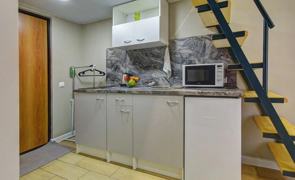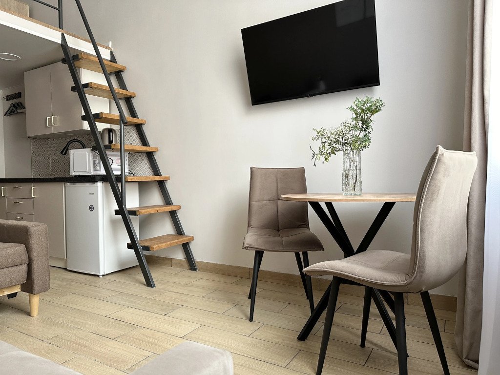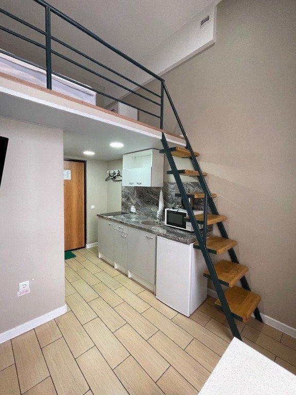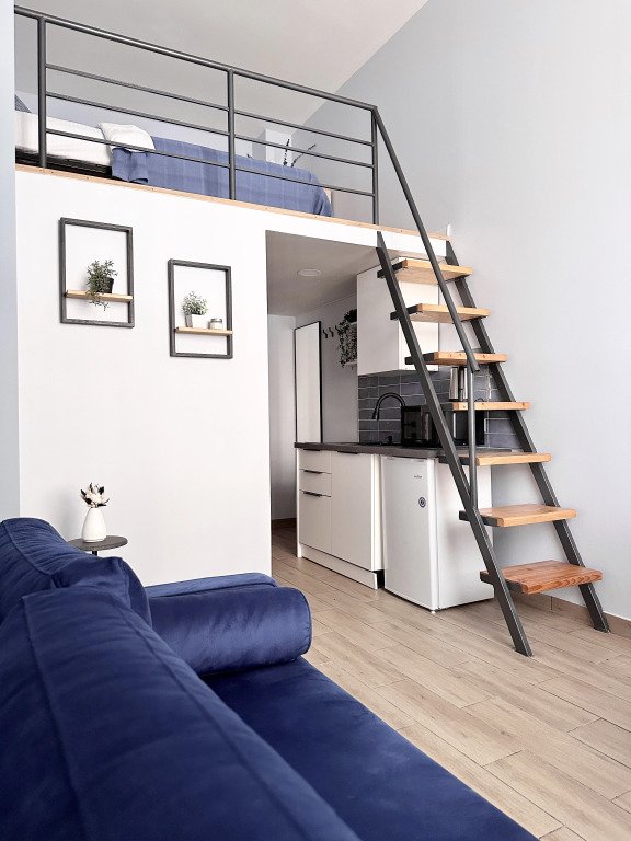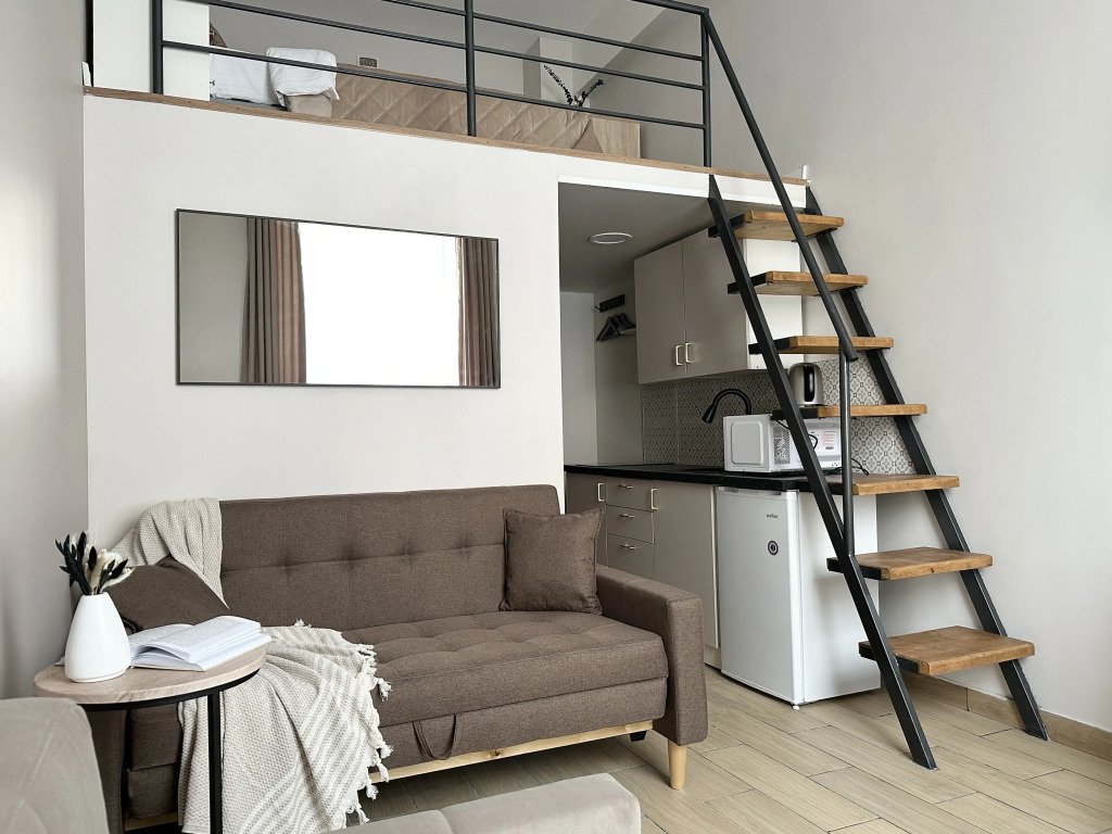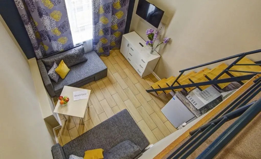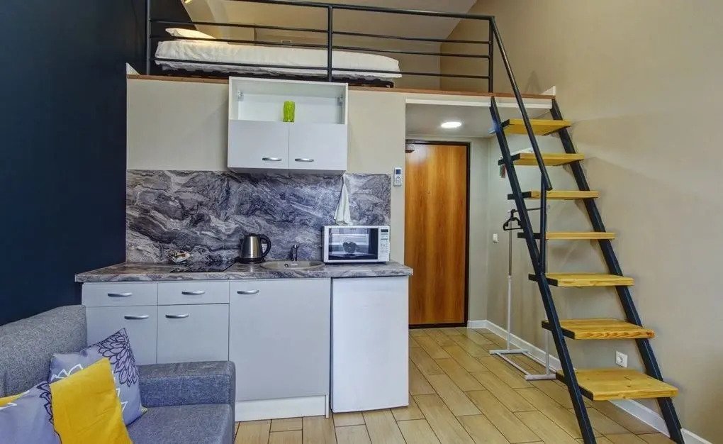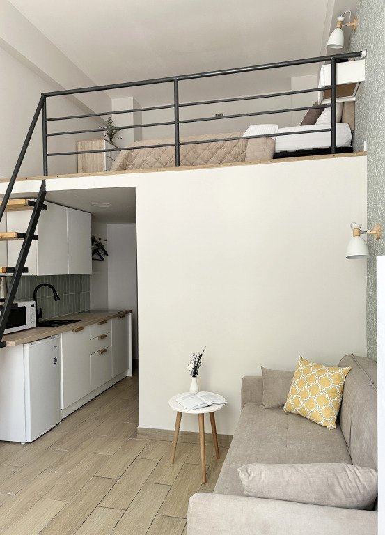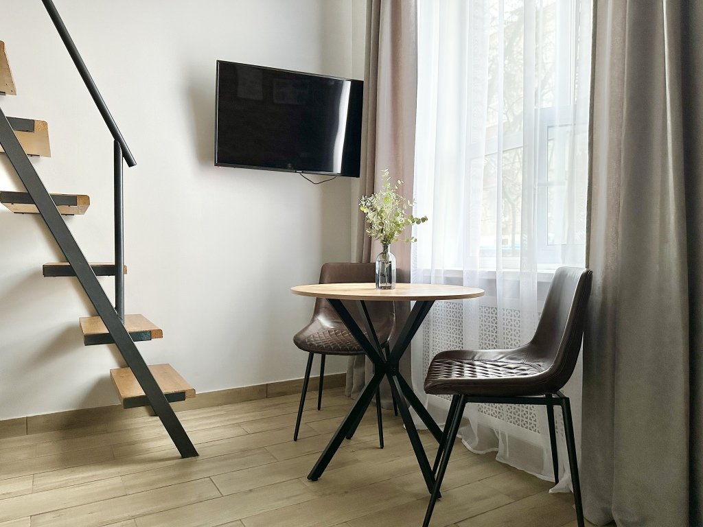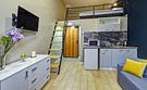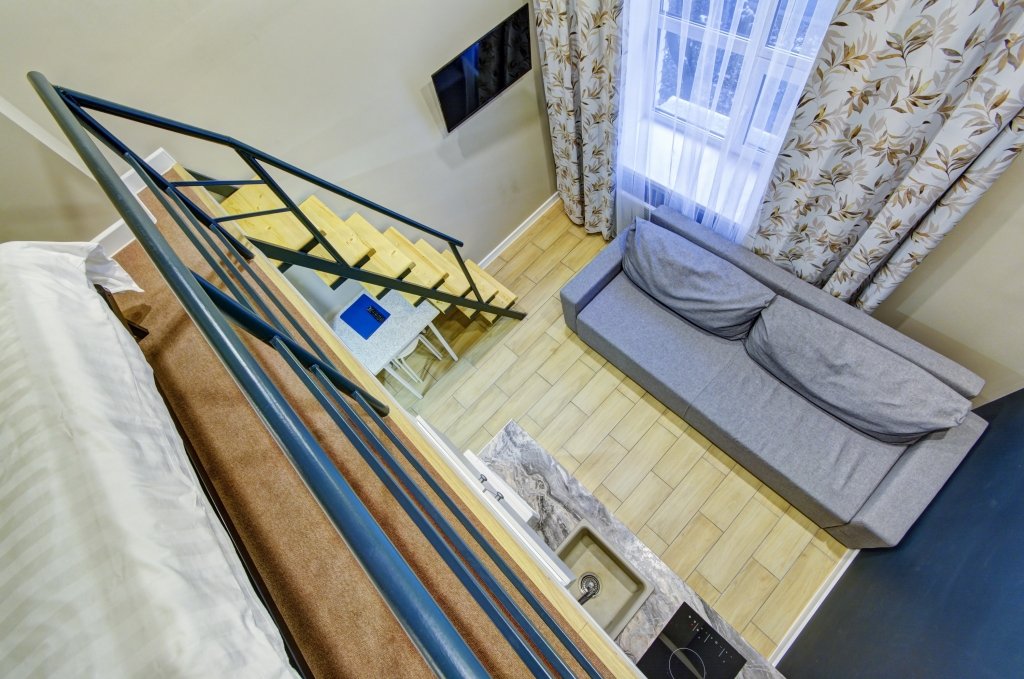 Все апартаменты имеют два уровня, на втором уровне, располагается спальня с ортопедическим основанием матрасом 160Х200, на первом уровне кухня и гостиная зона с мягким диваном-кроватью или креслом-кроватью и телевизором. Современная душевая с раковиной и санузлом. В апартаментах для пользования гостей: полотенца, постельное бельё, чай, кофе, сахар. В санузле: туалетно-косметические принадлежности, фен. Также есть кухня с плитой, всей необходимой посудой, холодильником, микроволновкой и чайником.