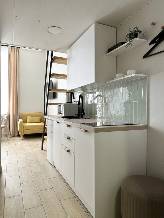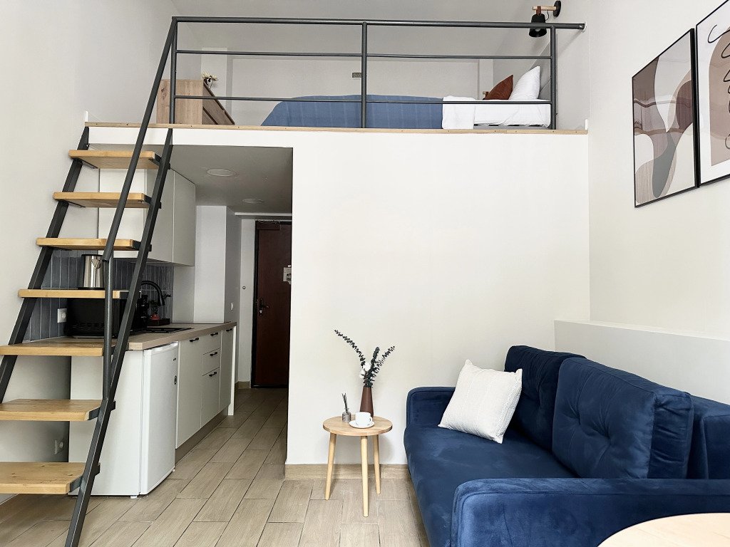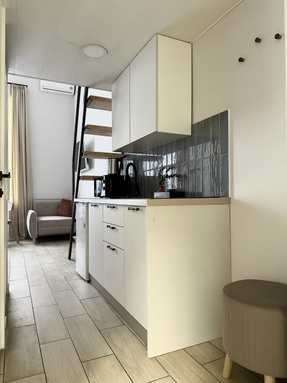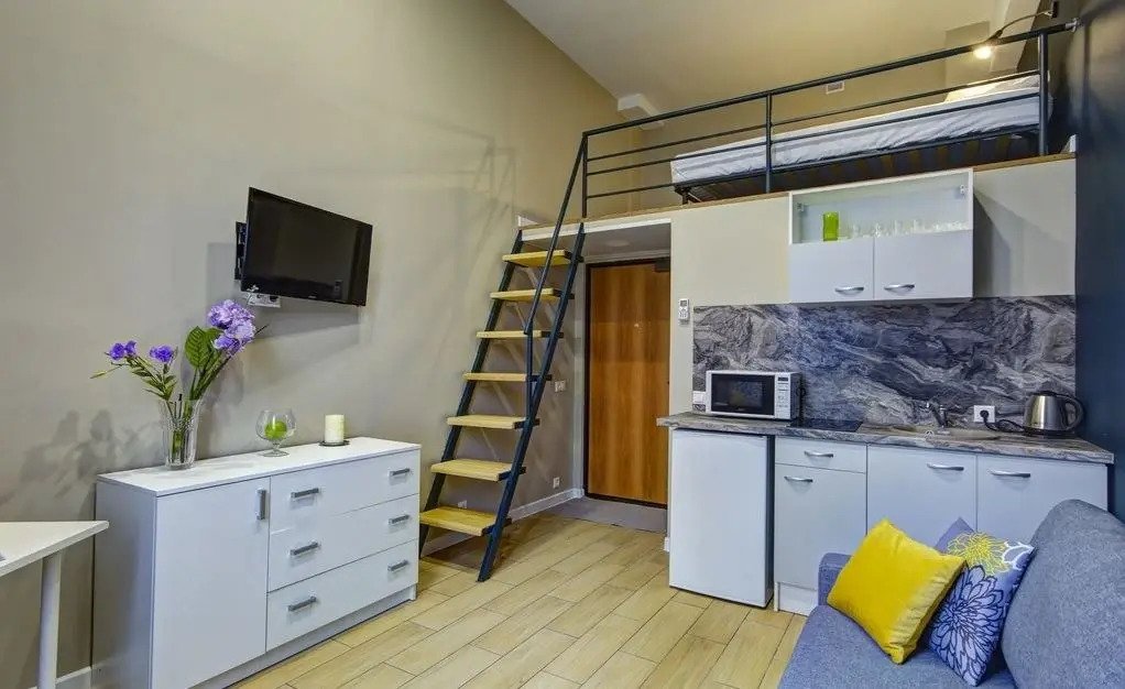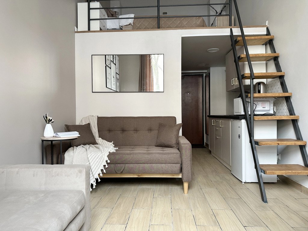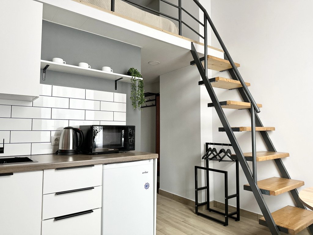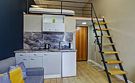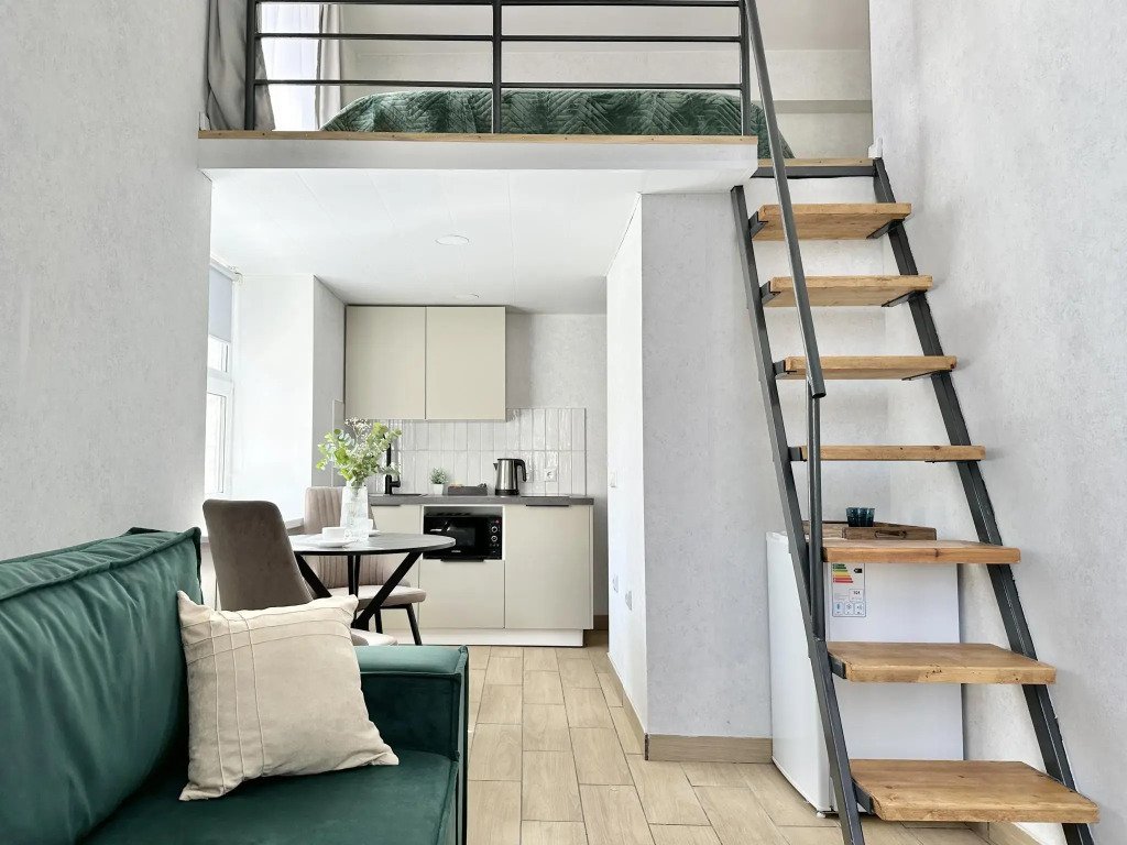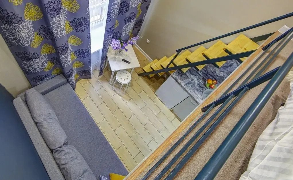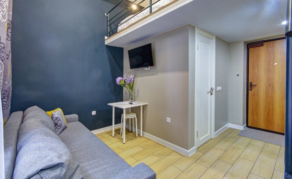 Все апартаменты имеют два уровня, на втором уровне, располагается спальня с ортопедическим основанием матрасом 160Х200, на первом уровне кухня и гостиная зона с мягким диваном-кроватью или креслом-кроватью и телевизором. Современная душевая с раковиной и санузлом. В апартаментах для пользования гостей: полотенца, постельное бельё, чай, кофе, сахар. В санузле: туалетно-косметические принадлежности, фен. Также есть кухня с плитой, всей необходимой посудой, холодильником, микроволновкой и чайником.