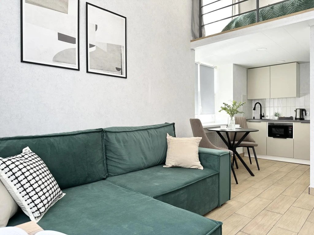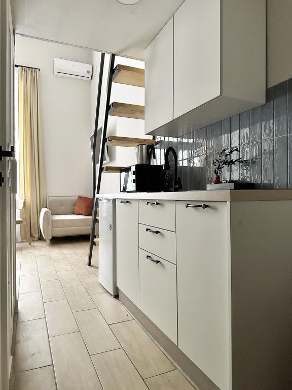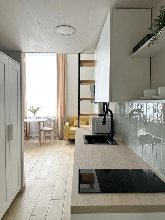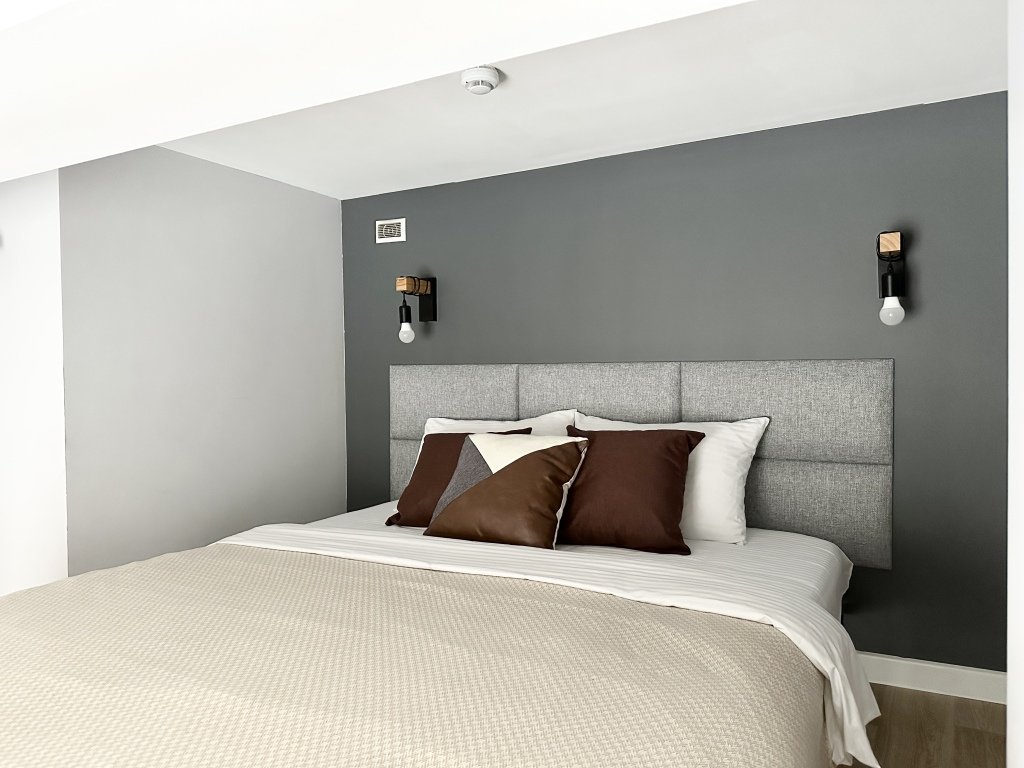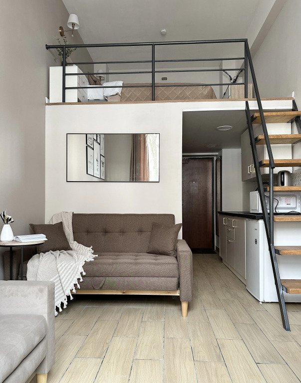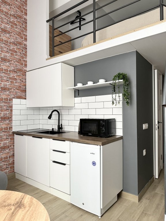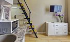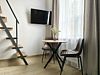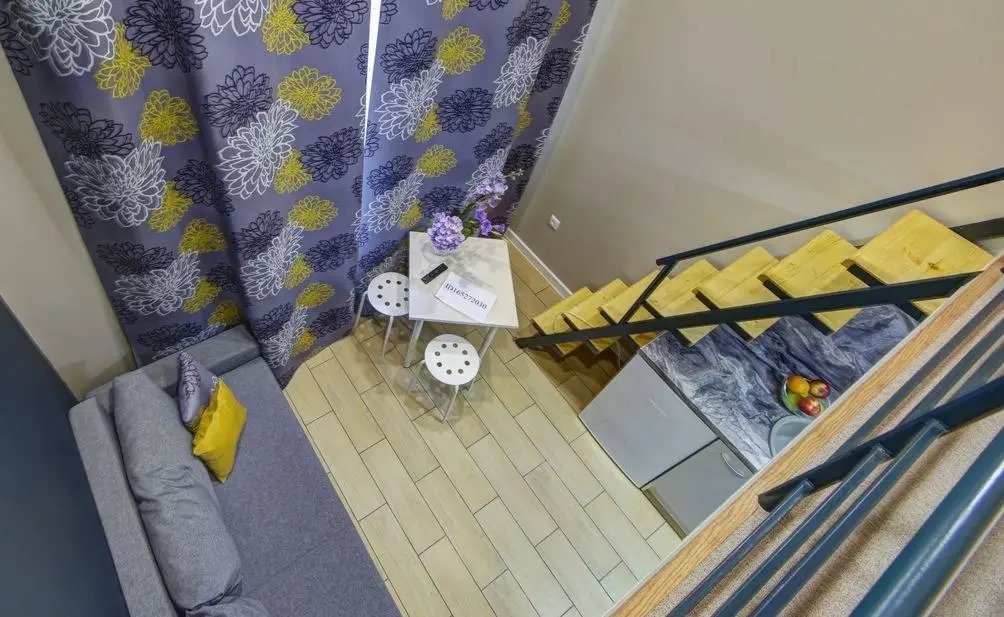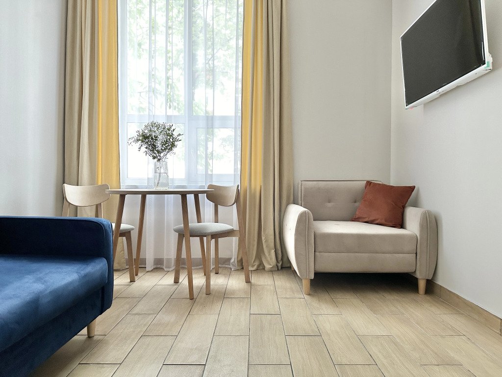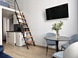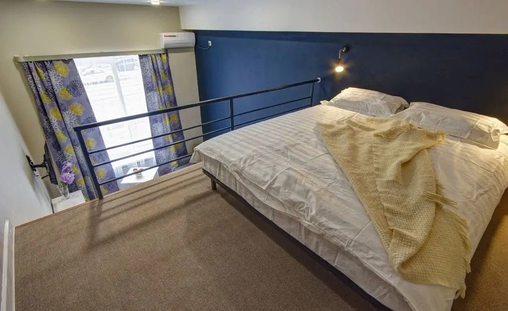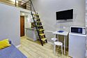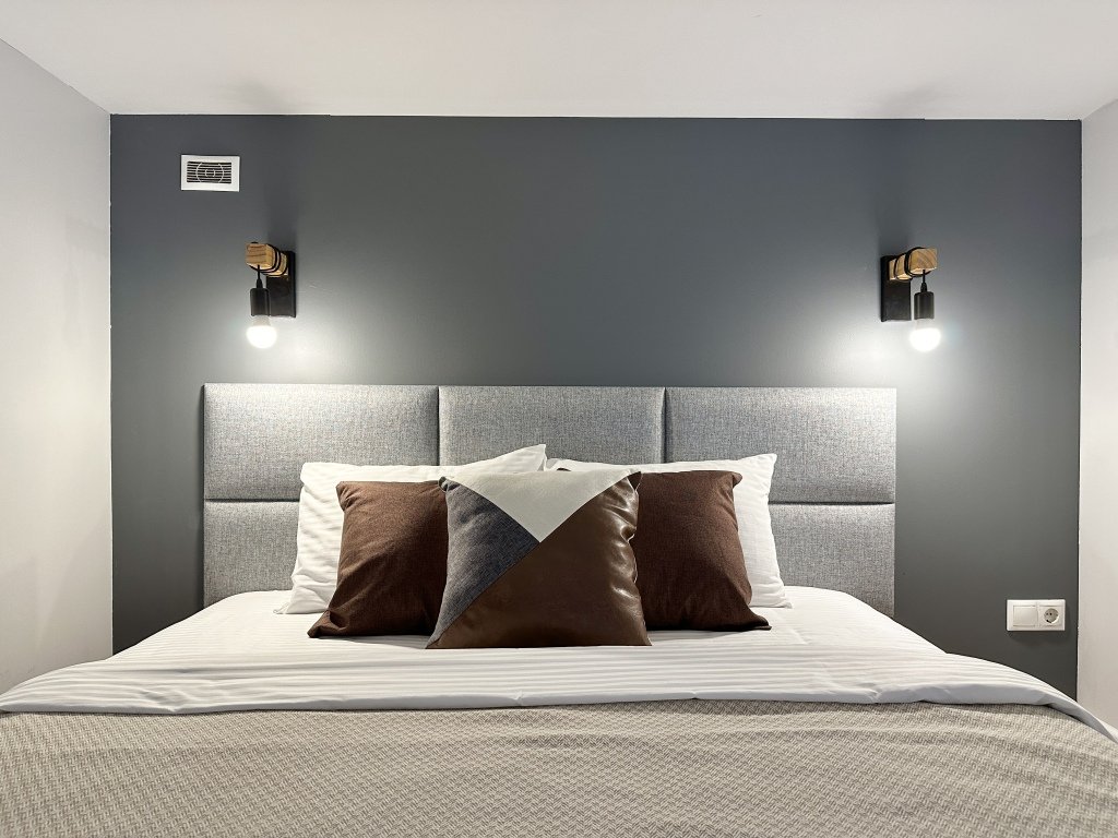 Все апартаменты имеют два уровня, на втором уровне, располагается спальня с ортопедическим основанием матрасом 160Х200, на первом уровне кухня и гостиная зона с мягким диваном-кроватью или креслом-кроватью и телевизором. Современная душевая с раковиной и санузлом. В апартаментах для пользования гостей: полотенца, постельное бельё, чай, кофе, сахар. В санузле: туалетно-косметические принадлежности, фен. Также есть кухня с плитой, всей необходимой посудой, холодильником, микроволновкой и чайником.