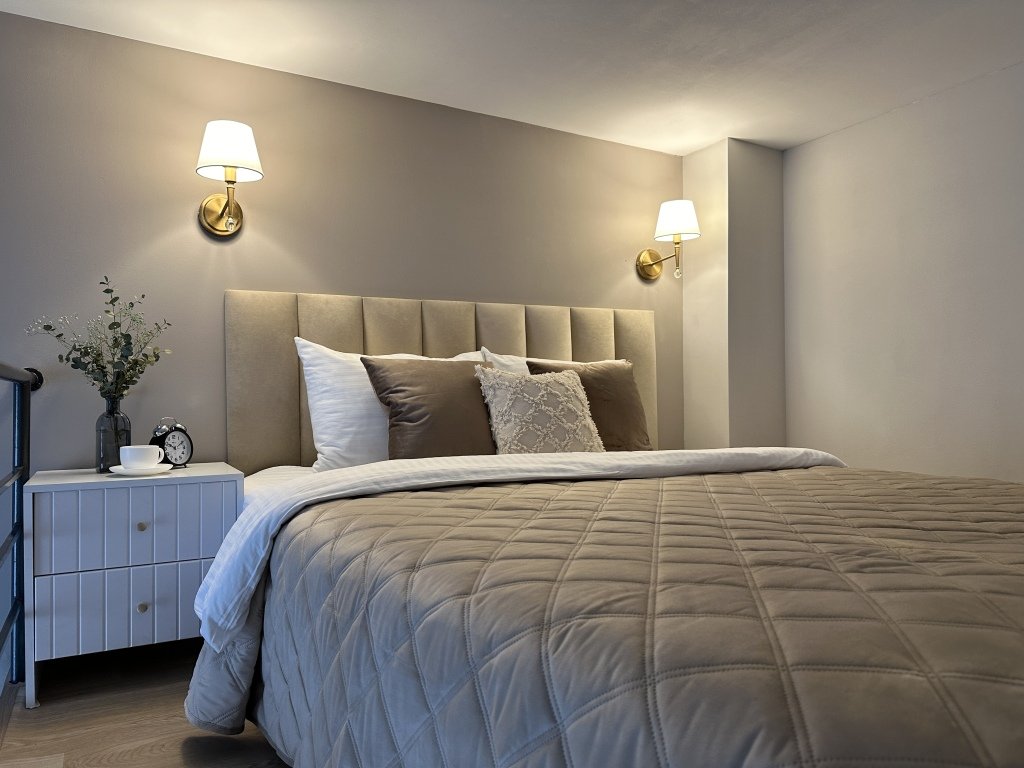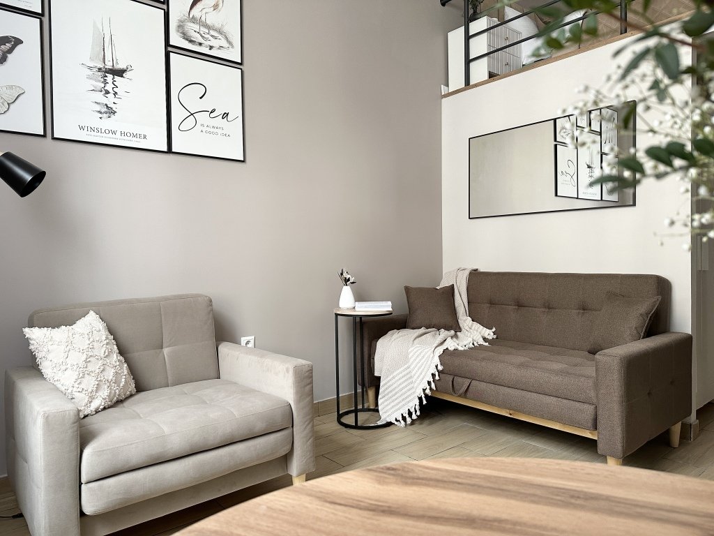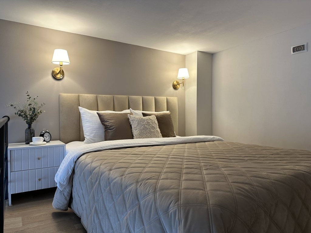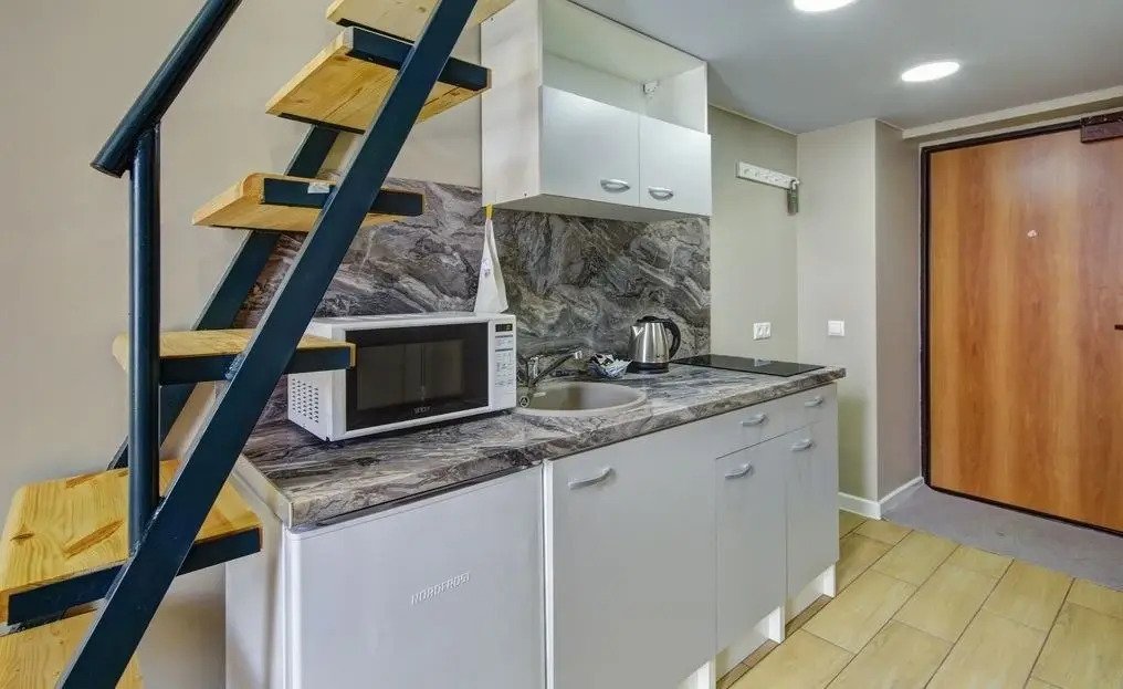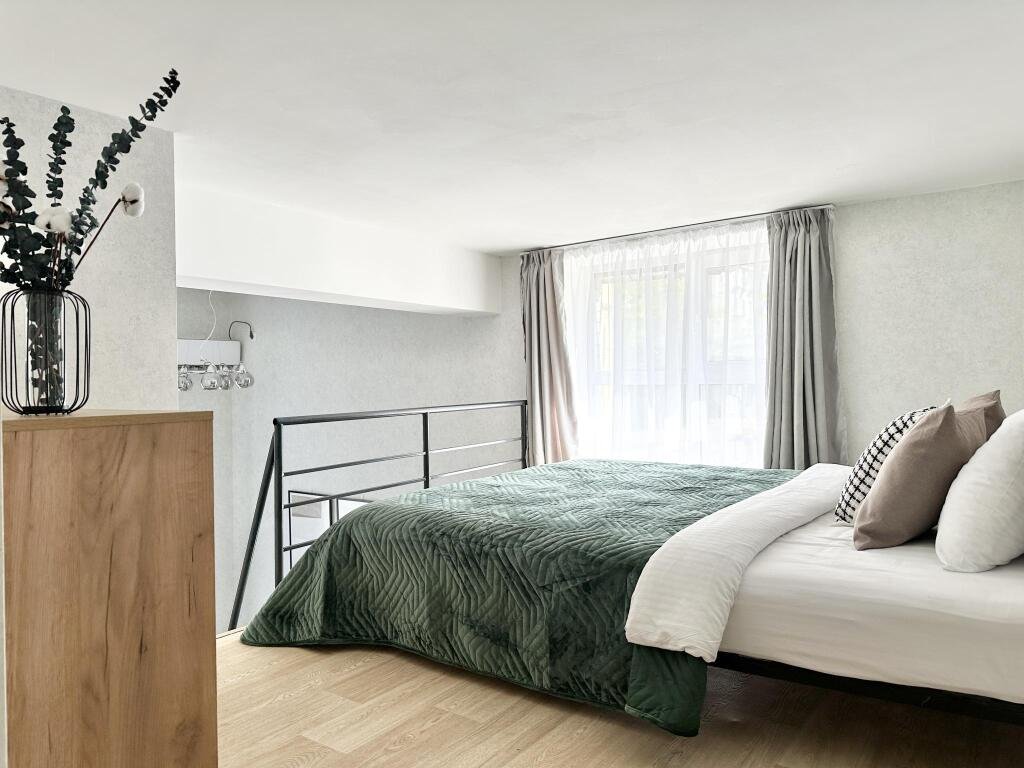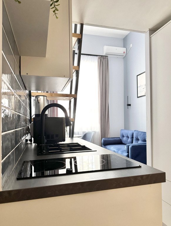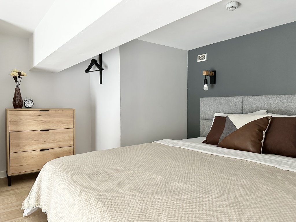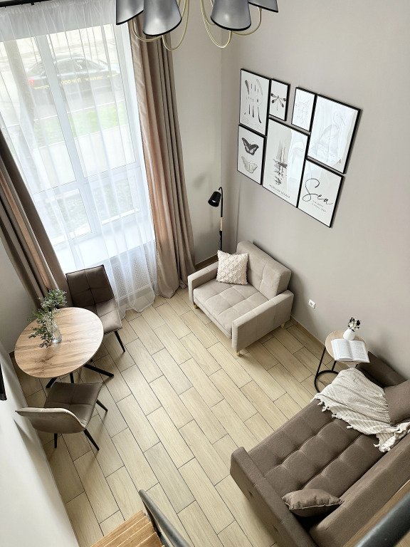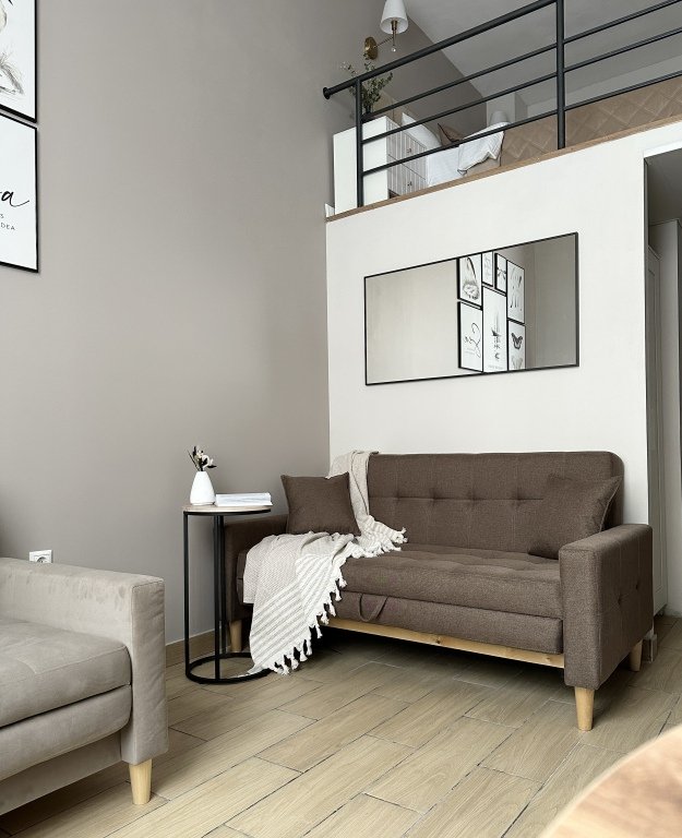 Все апартаменты имеют два уровня, на втором уровне, располагается спальня с ортопедическим основанием матрасом 160Х200, на первом уровне кухня и гостиная зона с мягким диваном-кроватью или креслом-кроватью и телевизором. Современная душевая с раковиной и санузлом. В апартаментах для пользования гостей: полотенца, постельное бельё, чай, кофе, сахар. В санузле: туалетно-косметические принадлежности, фен. Также есть кухня с плитой, всей необходимой посудой, холодильником, микроволновкой и чайником.