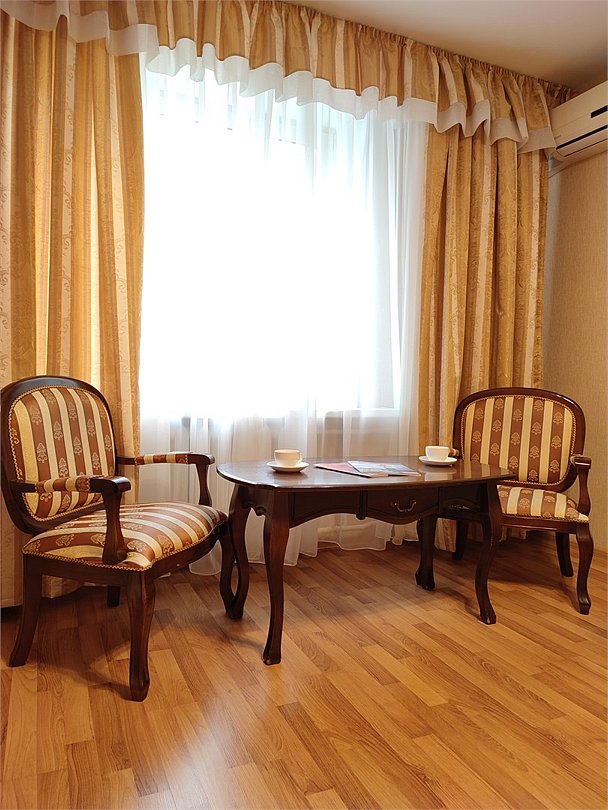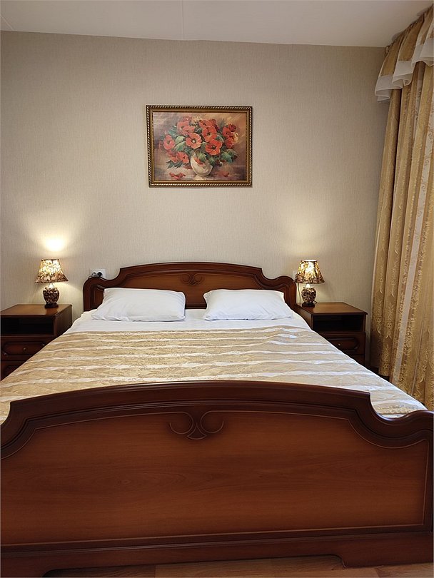Двухкомнатный номер. В спальне двуспальная кровать, в гостиной диван раскладывается на двоих. Номер оснащен: телевизором, кондиционером, холодильником, чайником, феном, так же имеется халат и тапочки. Собственная ванная комната. На всей территории WiFi.Услуги и удобства