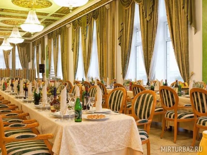 Интерьер банкетного зала выполнен в стиле царской эпохи. Хрустальные люстры, высокие колоны, позолоченная лепнина, огромные окна украшенные гардинами, стулья в стиле барокко - все это придаст вашему торжеству неповторимое праздничное настроение и подчеркнет значимость события. Меню ресторана весьма разнообразно и включает в себя русскую и европейскую кухни.