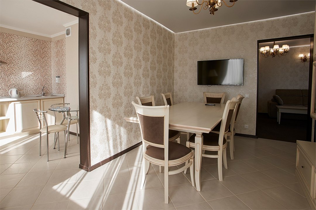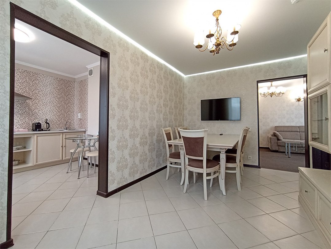 Трехкомнатный номер, с двумя спальнями либо со спальней и гостиной с набором мягкой мебели и полностью укомплектованной кухней с обеденной зоной. Также в номере организованно рабочее пространство с письменным столом. Дети до 7 лет проживают в любом номере с родителями бесплатно без предоставления дополнительного места. Детская кроватка предоставляется по запросу.Услуги и удобства