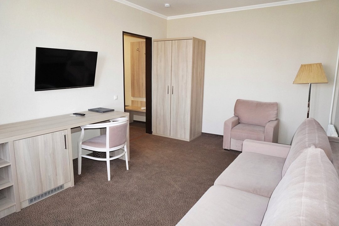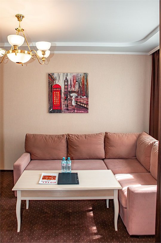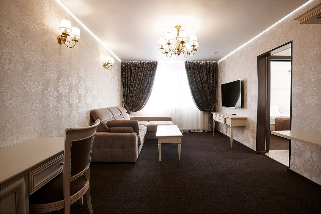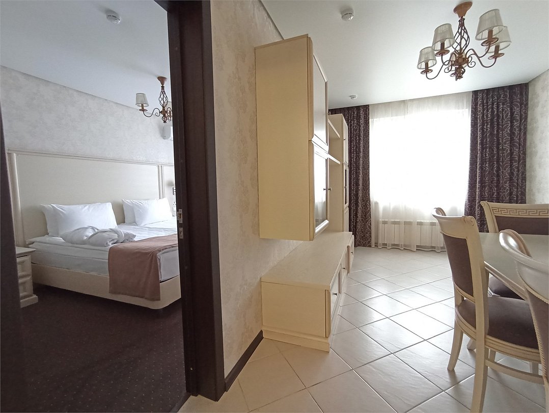 Двухкомнатный номер, состоящий из спальни с двуспальной кроватью, гостиной с набором мягкой мебели (диван и кресла). Раскладной диван может быть использован в качестве дополнительного места как для взрослого, так и для ребёнка. Раздельные туалетная и ванная комнаты. Дети до 7 лет проживают в любом номере с родителями бесплатно без предоставления дополнительного места. Детская кроватка предоставляется по запросу.Услуги и удобства