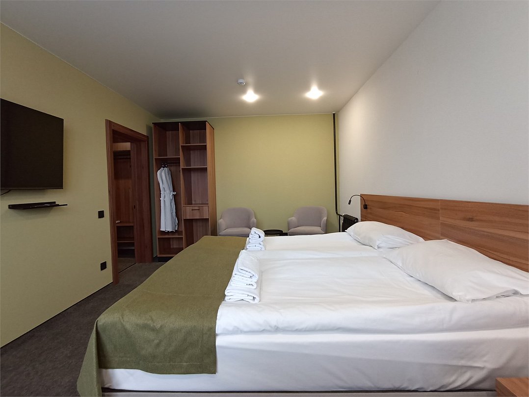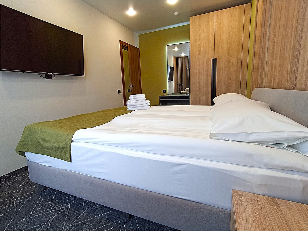 Благоустроенный однокомнатный номер: спальня с двуспальной либо двумя раздельными кроватями, полноценная кухня, ванная комната. Дети до 7 лет проживают в любом номере с родителями бесплатно без предоставления дополнительного места. Детская кроватка предоставляется по запросу.Услуги и удобства