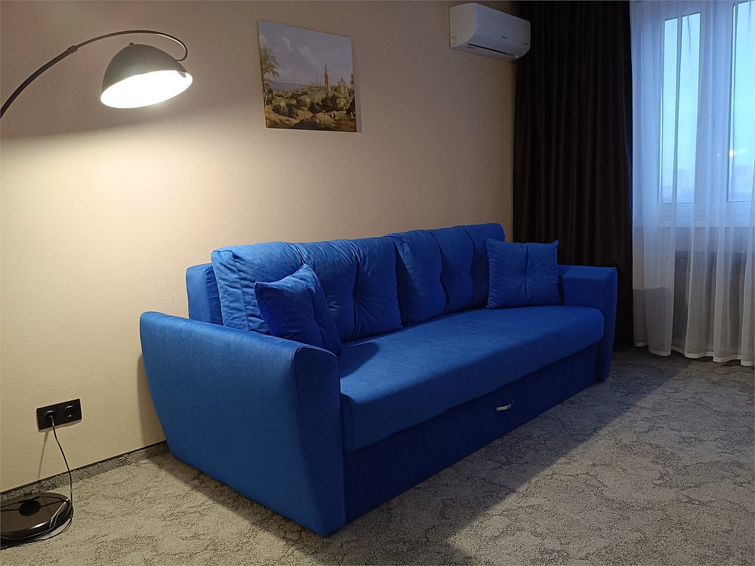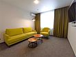Комфортабельный двухкомнатный номер БЕЗ КУХНИ. В номере современным дизайн помещений. Состоит из спальни, гостиной и ванной комнаты, удобная современная мебель, двуспальная кровать (180*200), организованное рабочее пространство с письменным столом, раскладной диван в гостиной может быть использован в качестве дополнительного места как для взрослого, так и для ребёнка . Номер укомплектован микроволновой печью, чайной станцией, кондиционером.Услуги и удобства