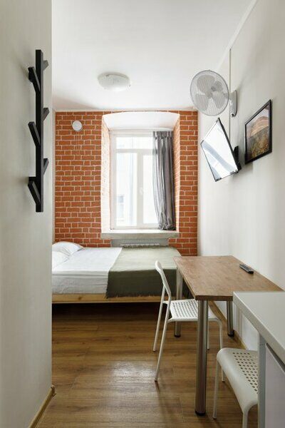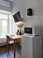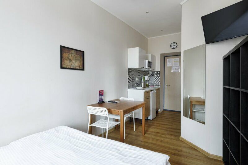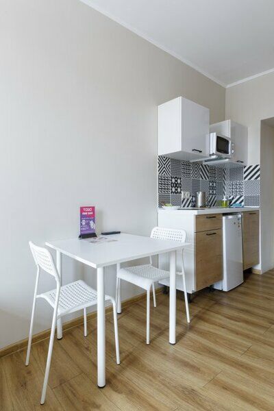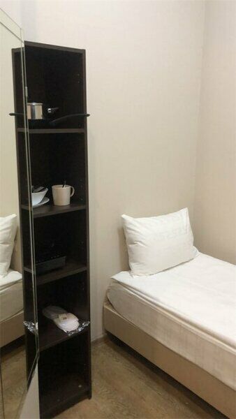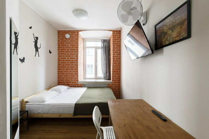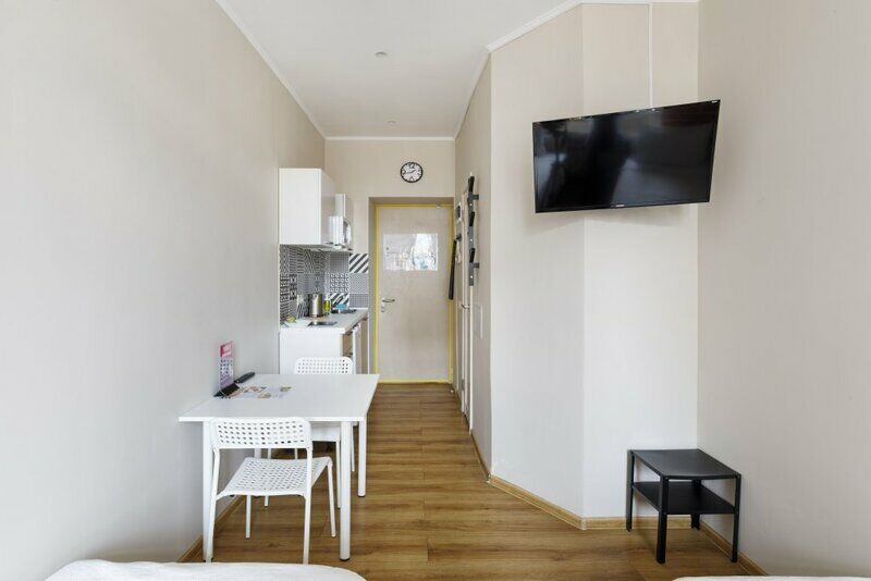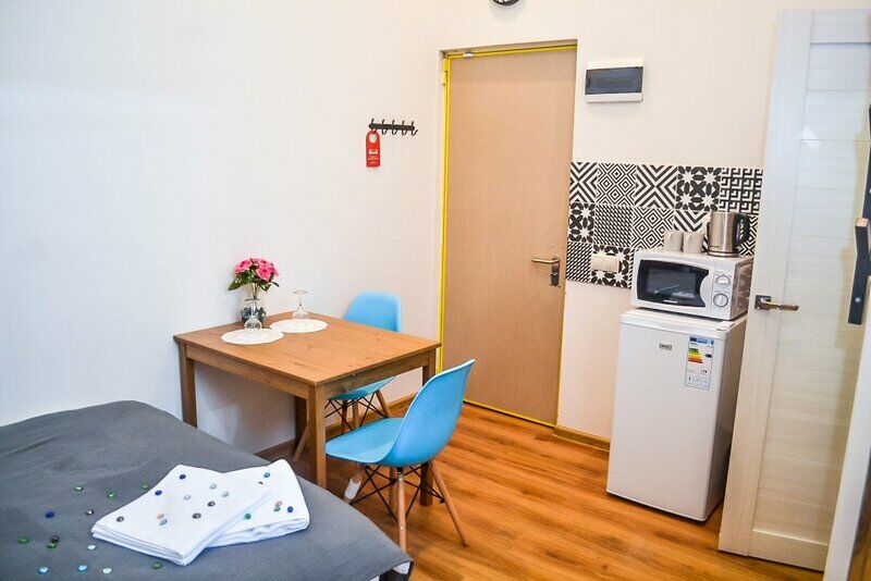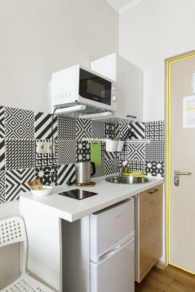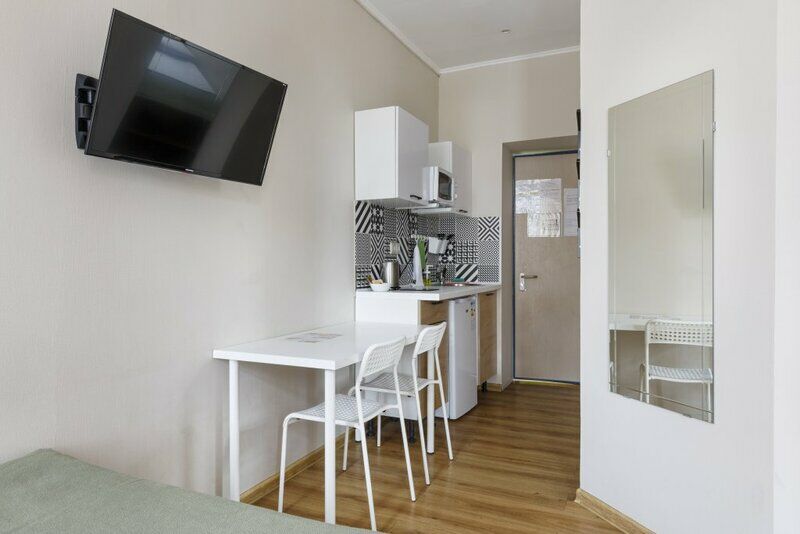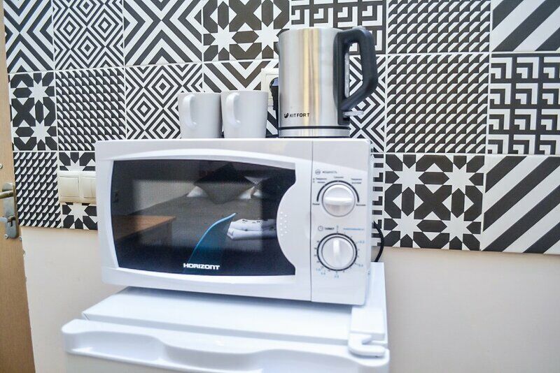 Номер маленький , чистый, приятное свежее постельное белье, жидкое мыло в ванной и на кухне. На кухне есть холодильник, плитка, микроволновка, кружки, бокалы, тарелки, кастрюля, столовые приборы.