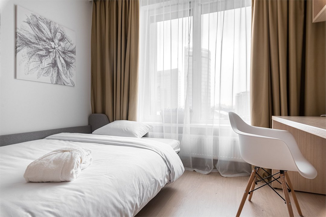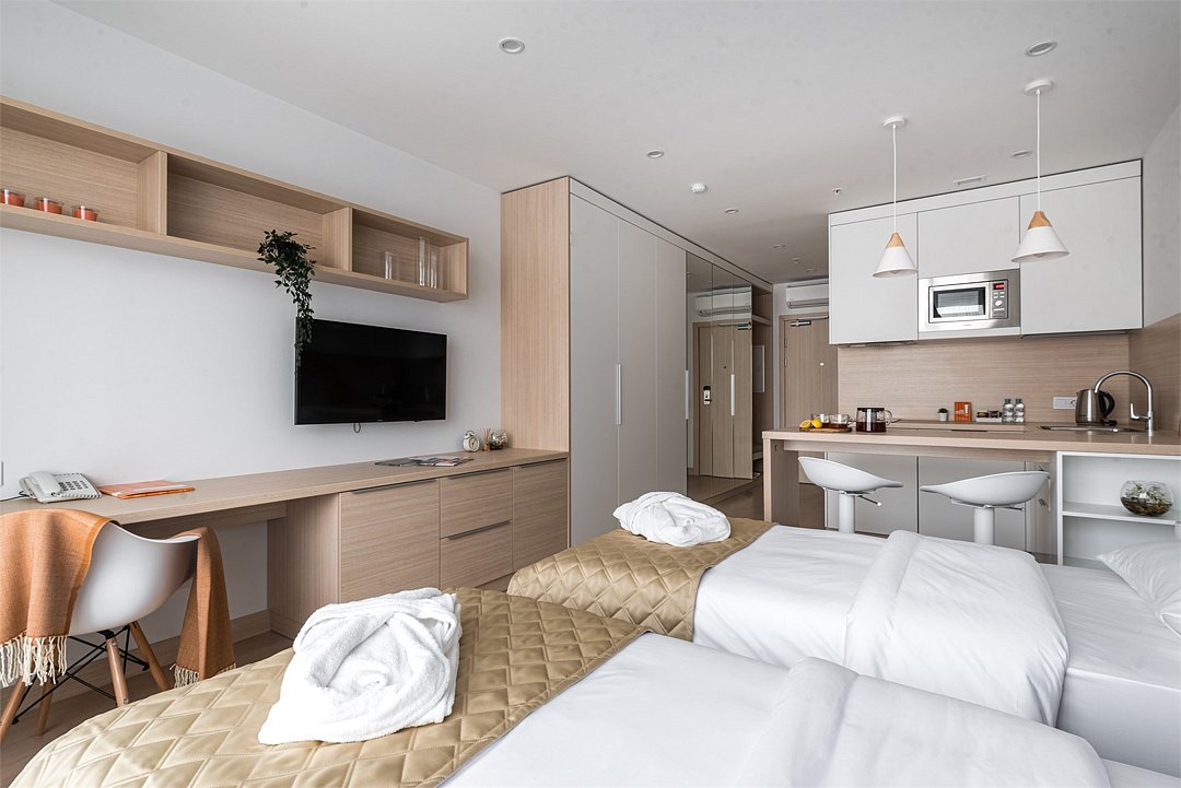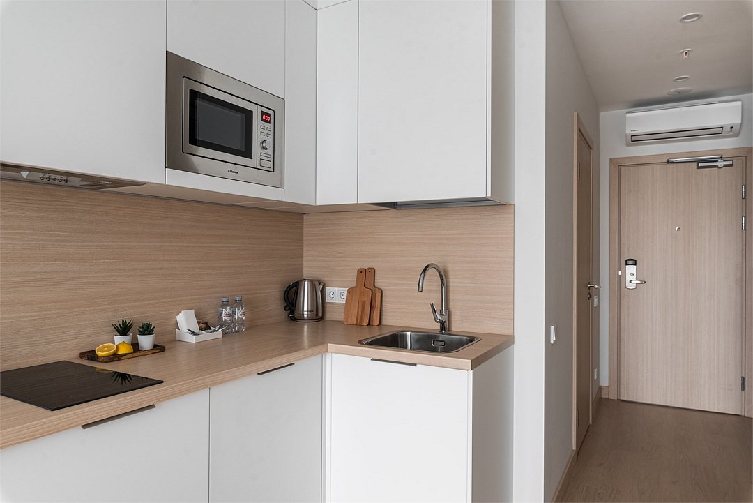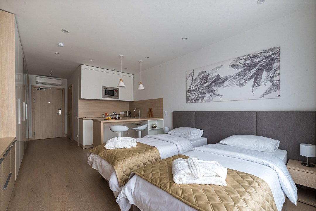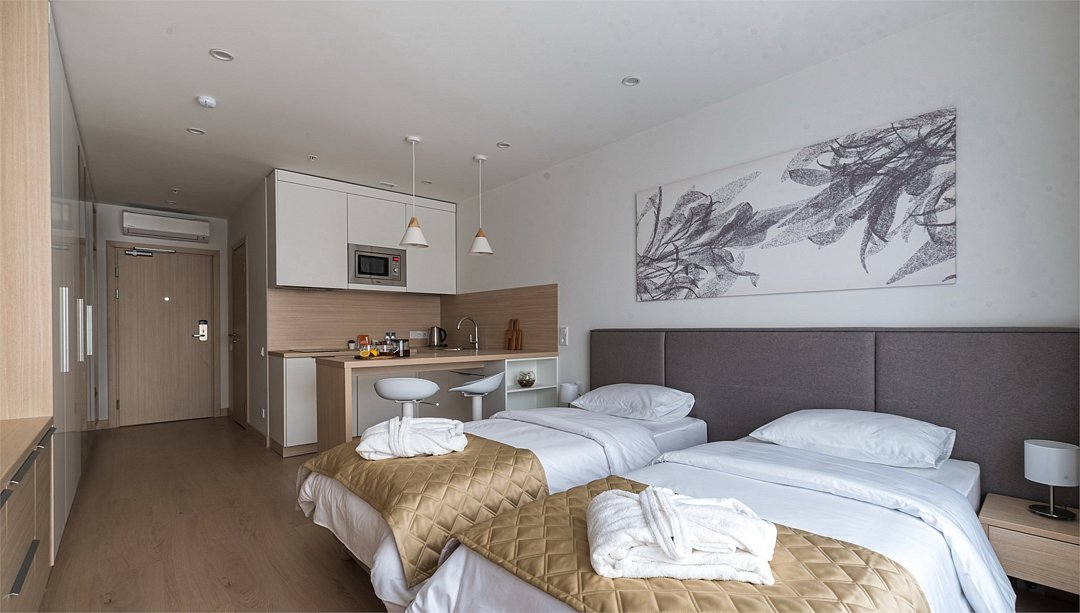 1-комнатный, 2-местный апартамент. площадь: 28кв.м. тип кровати TWIN - две односпальные кровати. ----------------------------------------------------------------------------------- Современный гостиничный номер, оборудованный всем необходимым и полноценной кухней, которая позволяет рассматривать данный вариант размещения и в формате среднесрочного и долгосрочного пребывания.Услуги и удобства