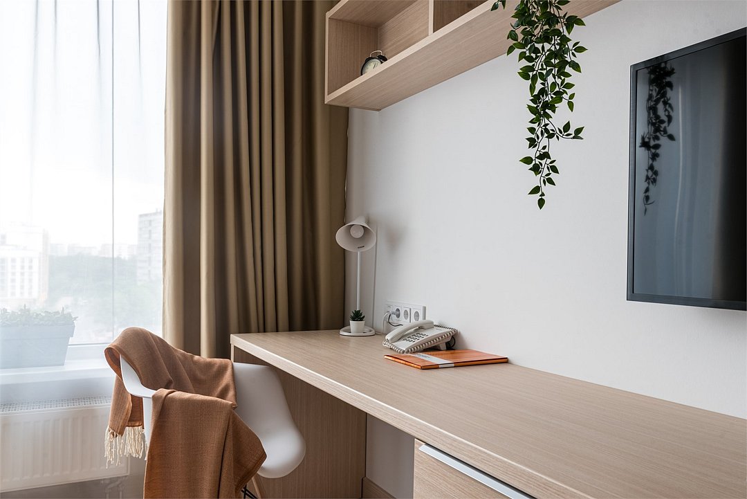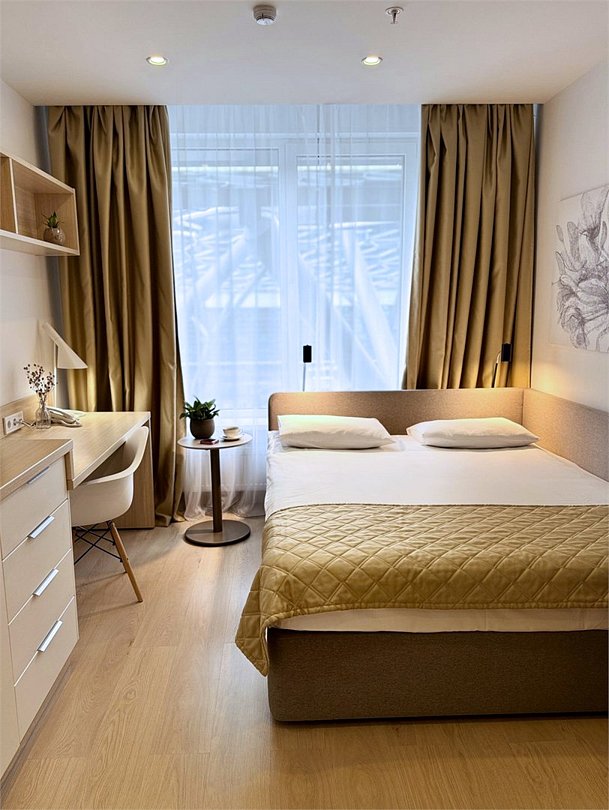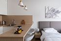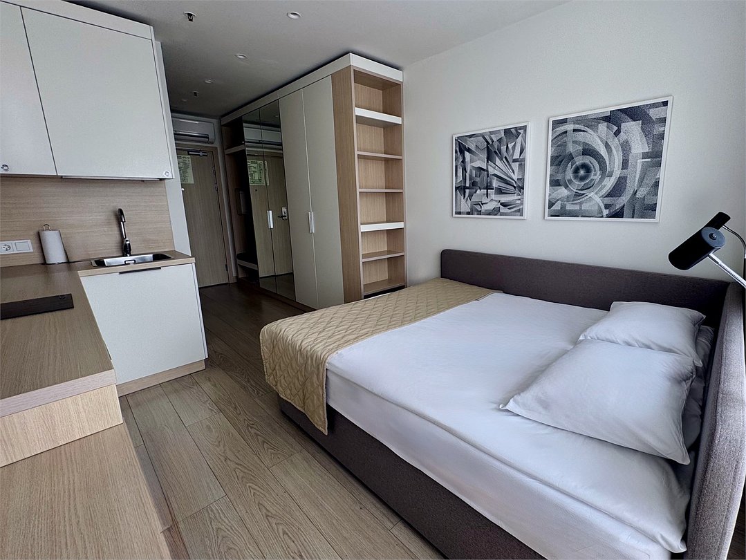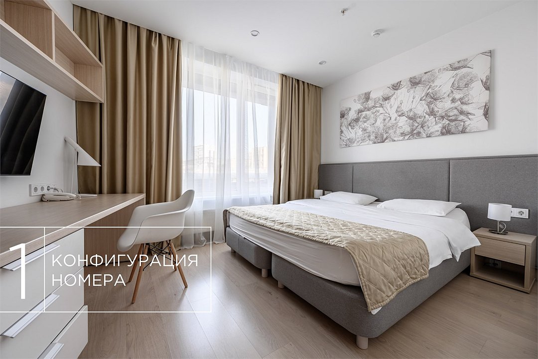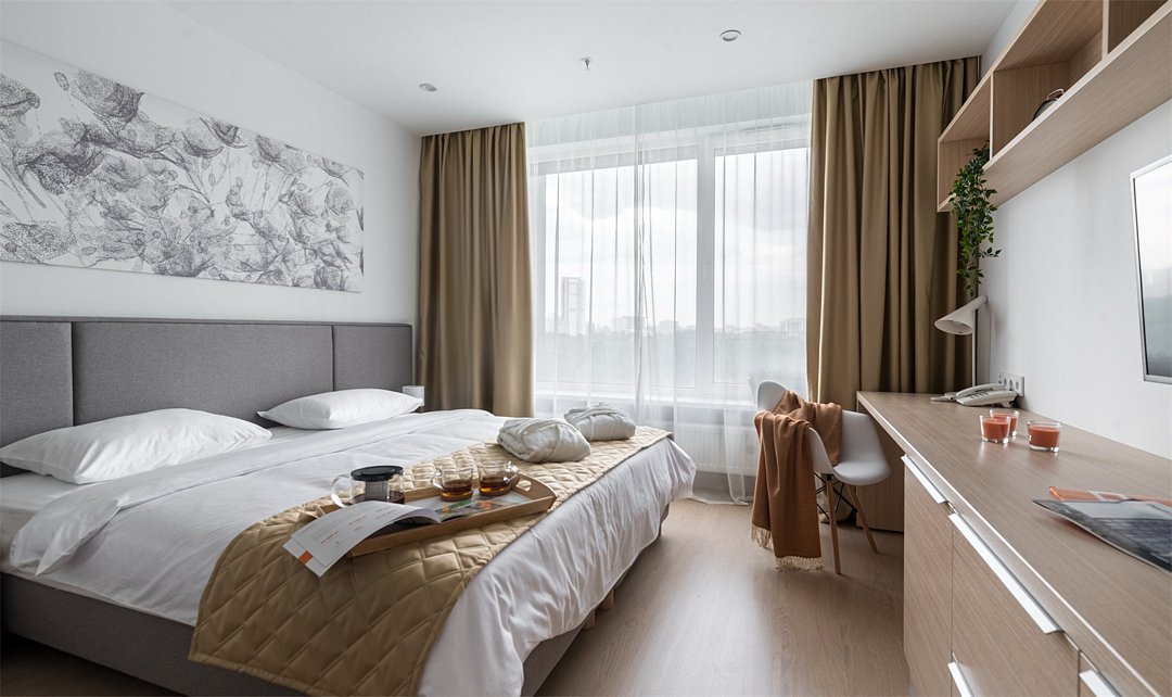1-комнатный, 2-местный апартамент. площадь: 28кв.м. тип кровати DOUBLE - одна двуспальная кровать. вид из окна: на город. ----------------------------------------------------------------------------------- Современный гостиничный номер, оборудованный всем необходимым и полноценной кухней, которая позволяет рассматривать данный вариант размещения и в формате среднесрочного и долгосрочного пребывания.Услуги и удобства
