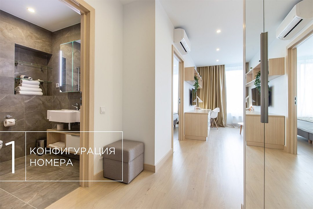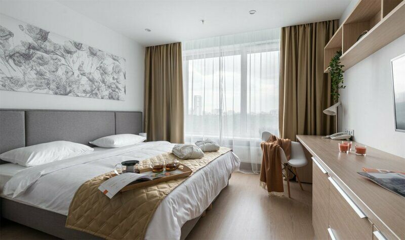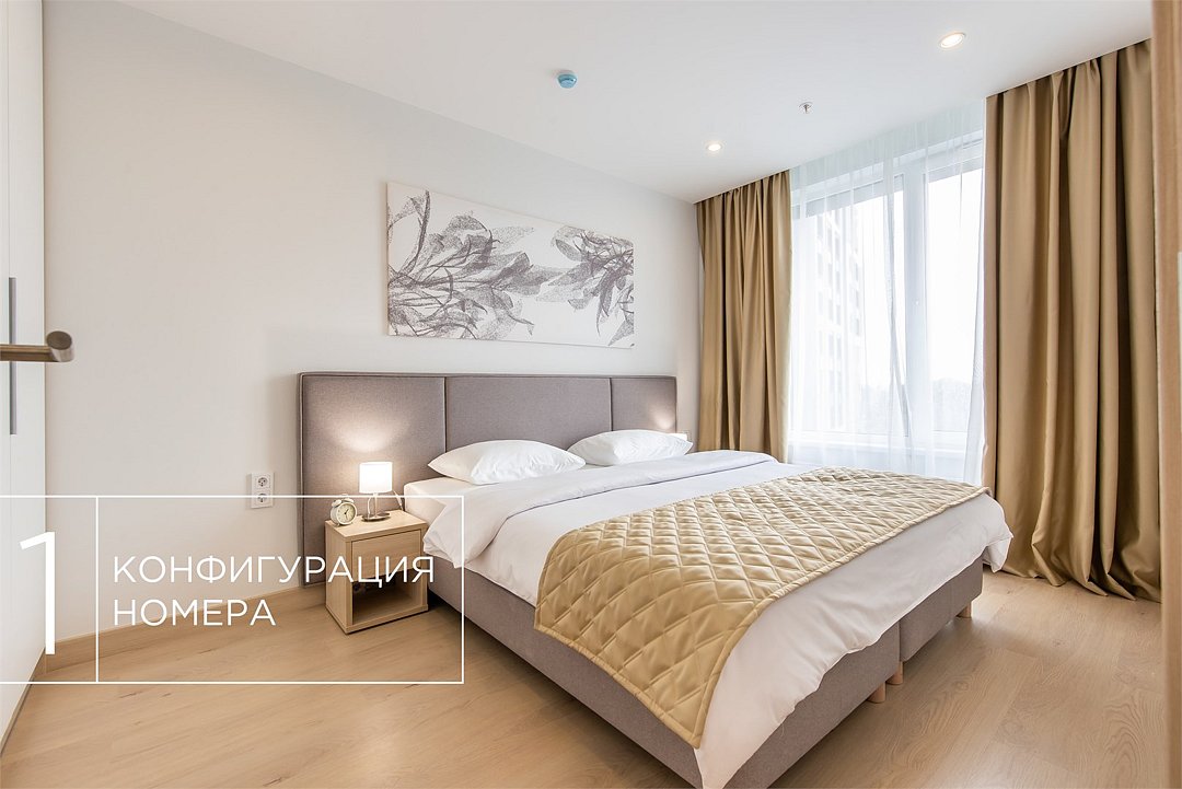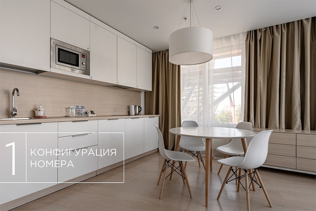 1-комнатный, 2-местный апартамент. площадь: 28кв.м. тип кровати (по умолчанию): DOUBLE - одна двуспальная кровать. вид из окна: на парк ("Сад будущего", "Ботанический сад" "ВДНХ"). При бронировании номера обязательно укажите предпочтения по кроватям. ----------------------------------------------------------------------------------- Современный гостиничный номер, оборудованный всем необходимым и полноценной кухней. С окон номера открывается живописный вид на Ботанический сад.Услуги и удобства