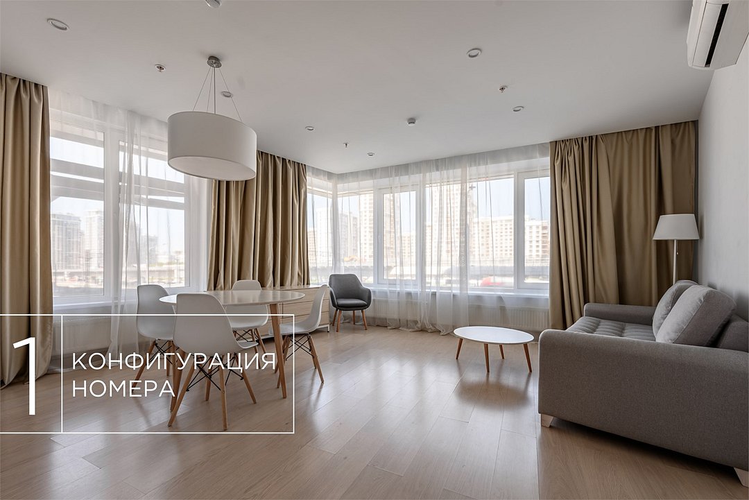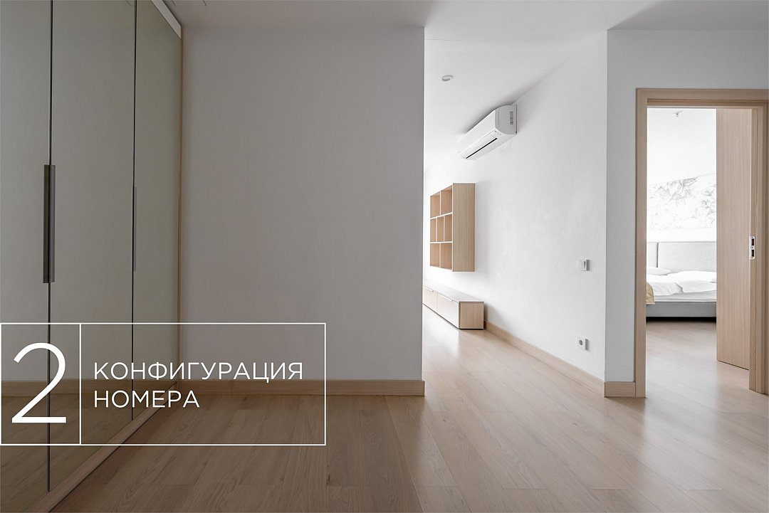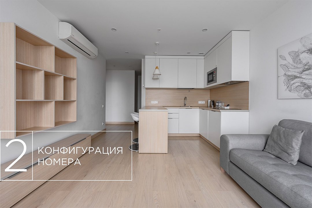 2-комнатный, возможно размещение до 4 гостей. площадь: 42кв.м. тип кровати: DOUBLE ----------------------------------------------------------------------------------- Просторный двухкомнатный апартамент, который благодаря своей планировке позволяет отделить личное пространство (1-ая комната, спальня) и пространство для отдыха, работы (2-ая комната, гостиная).Услуги и удобства
