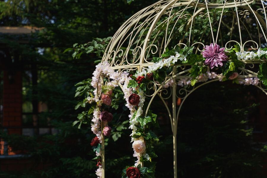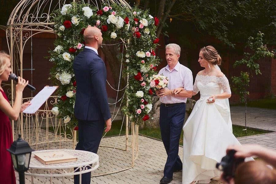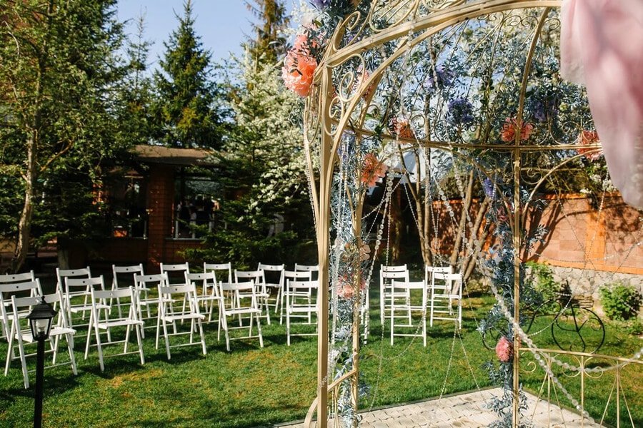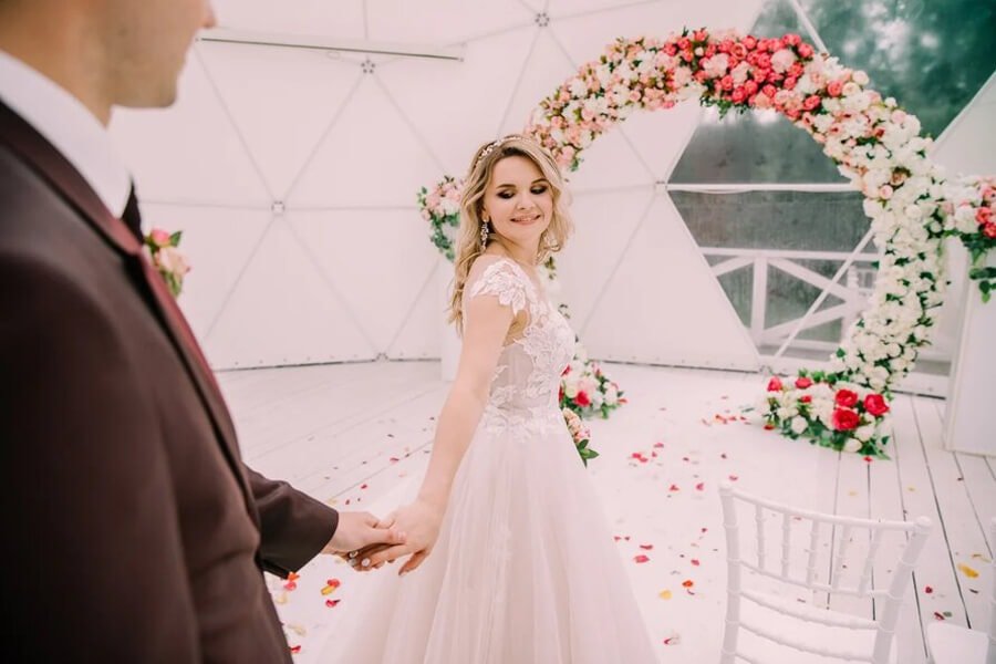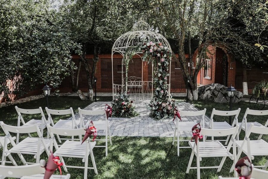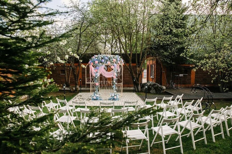 Большая и ухоженная территория включает в себя купольный шатёр с панорамными окнами вместимостью до 60 гостей и живописные локации для фотосессий и выездных регистраций.