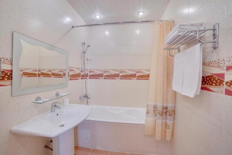 телевизор, спутниковое телевидение, Wi-Fi, телефон, кондиционер, светильник, настольные лампы, фен, электронные замки, ванная комната, санузел, халаты, тапочки, гигиенические средства, косметические средства, двуспальная кровать, ортопедический матрас, диван, кресла, тумбы, стулья, шкаф для одежды, вешалки, журнальный столик, письменный стол, багажная тумба, зеркало, письменные принадлежности, чайный набор, обслуживание номеров, информационная карта, меню, сейф, чайник, раковина, мягкая мебель, косметическое зеркало, вид на город, вид во двор, туалет, фригобар, без питомцевВ номере