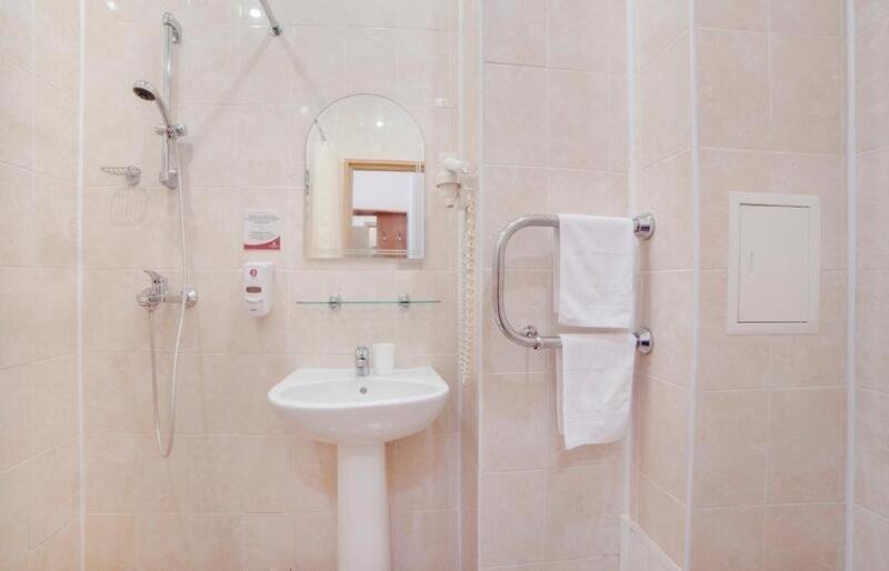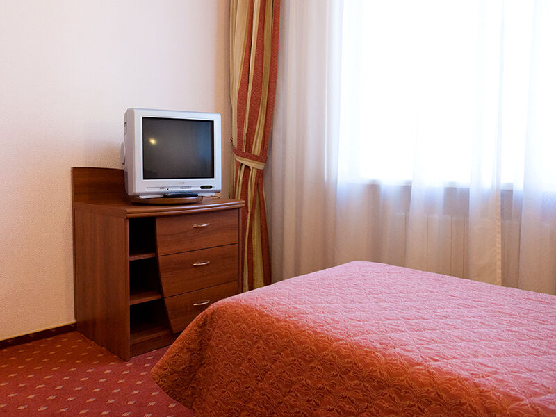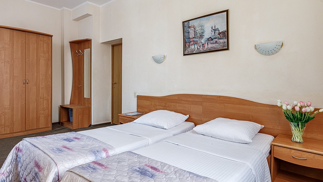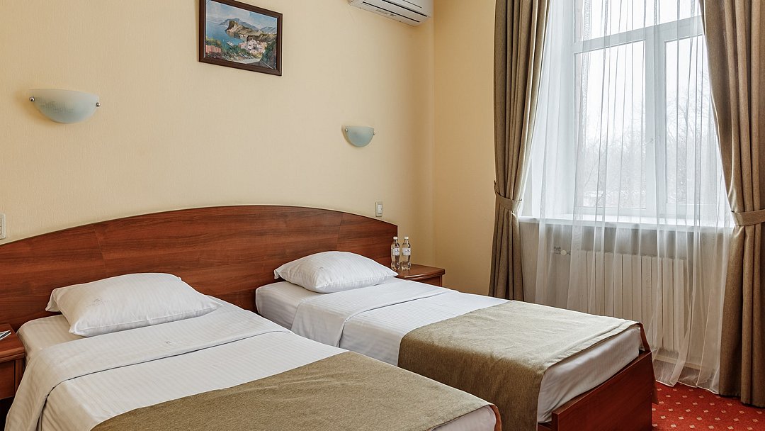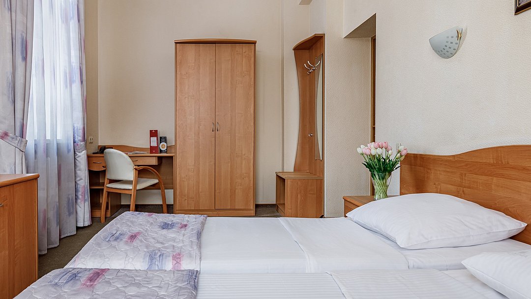 телевизор, спутниковое телевидение, кабельное телевидение, интерактивное телевидение, Wi-Fi, телефон, холодильник, светильник, настольные лампы, фен, электронные замки, ванная комната, душевая кабина, санузел, гигиенические средства, косметические средства, две односпальные кровати, ортопедический матрас, тумбы, стулья, шкаф для одежды, вешалки, письменный стол, багажная тумба, зеркало, письменные принадлежности, обслуживание номеров, информационная карта, меню, унитаз, раковина, ковровое покрытие, отопление, вид на город, вид во двор, без питомцевВ номере