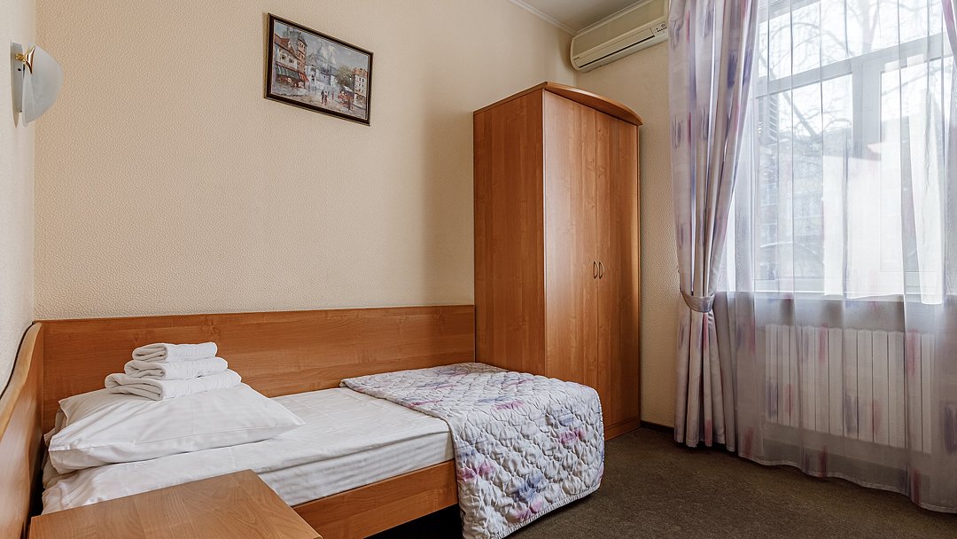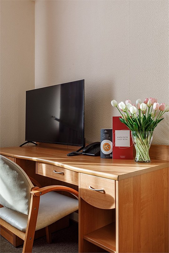 кабельное телевидение, интерактивное телевидение, Wi-Fi, телефон, светильник, настольные лампы, фен, электронные замки, ванная комната, ванна или душевая кабина, санузел, тапочки, гигиенические средства, косметические средства, односпальная кровать, ортопедический матрас, тумбы, стулья, шкаф для одежды, вешалки, письменный стол, багажная тумба, зеркало, чайный набор, обслуживание номеров, информационная карта, меню, минеральная вода, чайник, унитаз, раковина, косметическое зеркало, ковровое покрытие, вид на город, кулер на этаже, вид во двор, стаканы, цифровое тв, внутренний телефон, телевизор с плоским экраном, мини-холодильник, телевизор со Smart TV, номер для некурящих, чайная станция, уборка номера, набор для приготовления чая и кофе, услуги прачечной (платно), мыло, прачечная (за дополнительную плату), комната для переговоров (за дополнительную плату), без питомцевВ номере