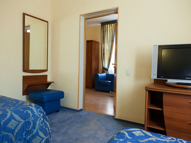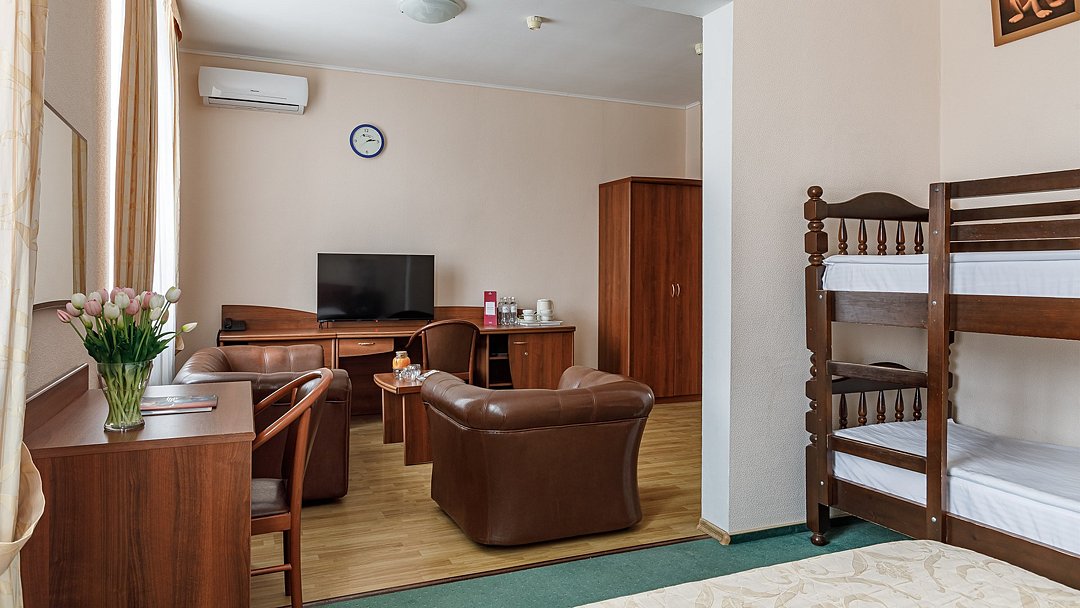 Отличный номер для семейного отдыха или для размещения компании друзей. - Площадь номера от 34 кв.м. (две комнаты и общая прихожая) - В одной из комнат - две раздельные кровати 90*200 см. - Во второй комнате - одна кровать 90*200 см. - Бесплатный Wi-Fi - Индивидуальный сейф - Электрический чайник - Чайная пара - Чай, кофе, сахар и сливки - Кондиционер (не во всех номерах) - Два письменных стола - Телефон - Два телевизора - Спутниковое телевидение - Два шкафа для верхней одежды В ванной комнате: - Раздельный санузел - Душ - Фен - Комплект полотенец - Диспенсер с моющим средством - ТапочкиУслуги и удобства