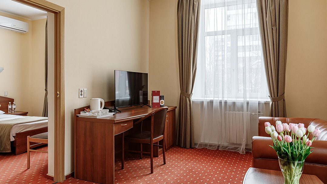 телевизор, спутниковое телевидение, кабельное телевидение, Wi-Fi, телефон, настольные лампы, фен, будильник, электронные замки, ванная комната, ванна, санузел, тапочки, гигиенические средства, косметические средства, две односпальные или большая двуспальная кровать, ортопедический матрас, диван, кресла, тумбы, стулья, шкаф для одежды, вешалки, журнальный столик, письменный стол, багажная тумба, зеркало, две комнаты, письменные принадлежности, чайный набор, обслуживание номеров, информационная карта, меню, сейф, чайник, унитаз, раковина, мягкая мебель, косметическое зеркало, вид на город, вид во двор, можно с питомцамиВ номере