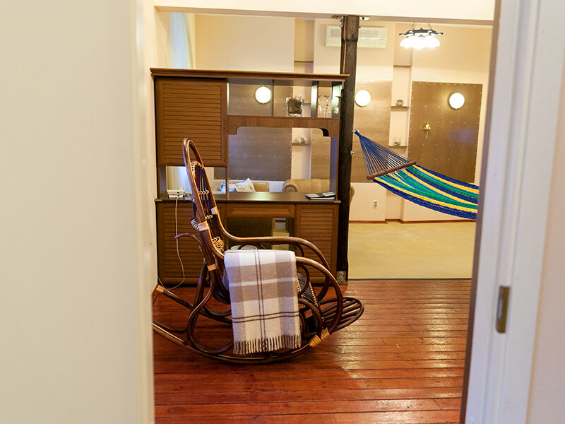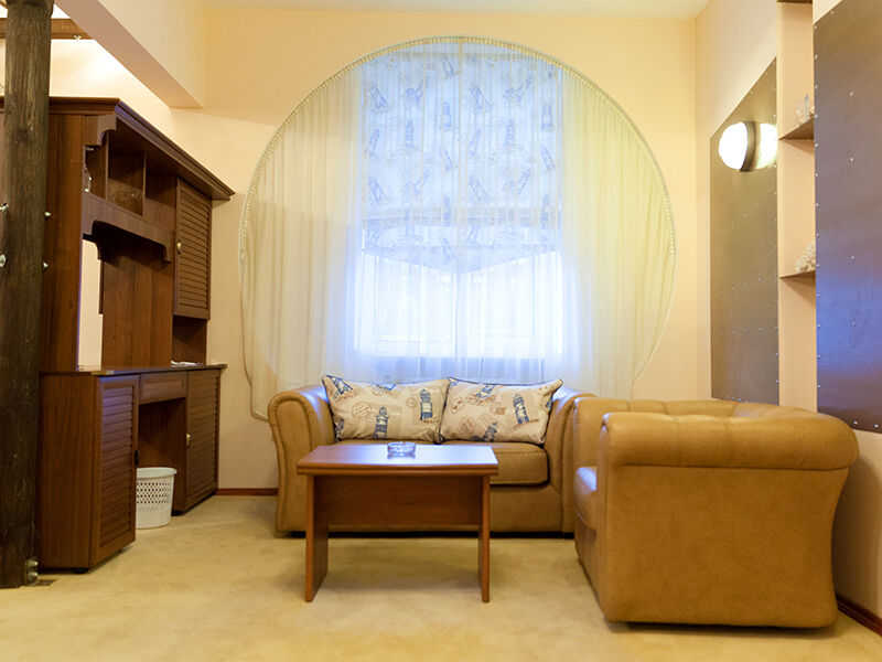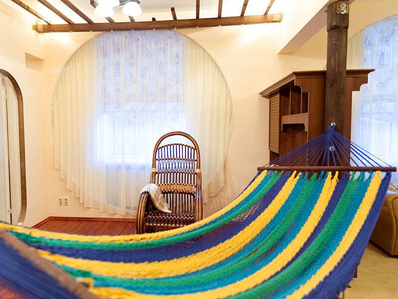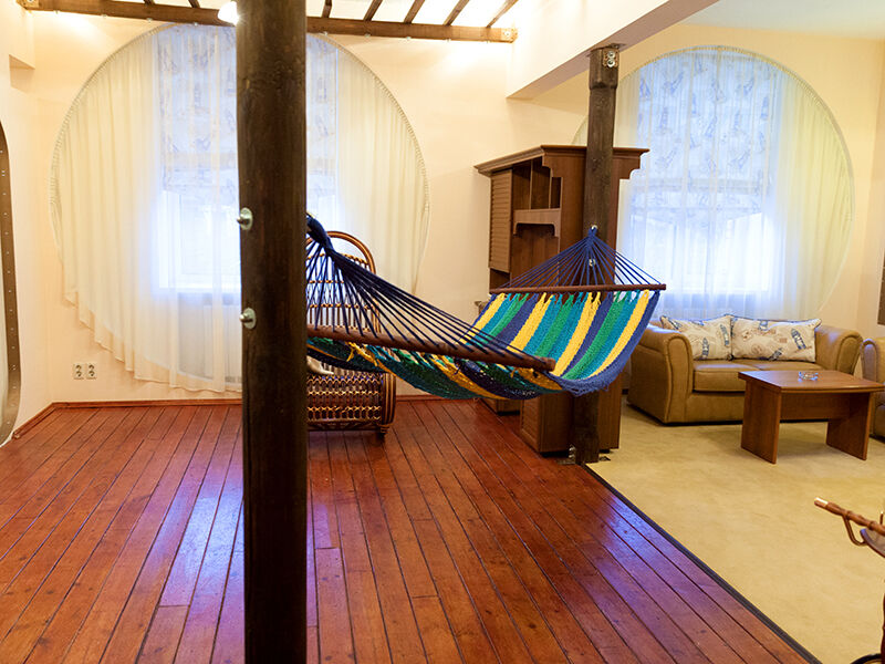 Для наиболее взыскательных путешественников мы предлагаем самый необычный и востребованный номер в Максима Заря Отель. Номер оформлен в Морском стиле: иллюминаторы, переборки, рында, барометр и гамак в центре комнаты! - Площадь номера 55 кв.м., 2 комнаты - Кровать king-size 200*220 см. - Бесплатный Wi-Fi - Индивидуальный сейф - Чайная пара - Чай, кофе, сахар и сливки - Минеральная вода - Швейный набор - Расческа - Кондиционер - Диван - Два кресла - Кресло-качалка - Телефон - Журнальный столик - Письменный стол - Широкоформатный ЖК телевизор - Музыкальный центр - Спутниковое телевидение - Шкаф для верхней одежды - Дополнительное место предоставляется по запросу (стоимость без питания 1500 руб./сутки) - Дети до 10 лет включительно размещаются бесплатно без предоставления дополнительного места В ванной комнате: - Джакузи - Душ - Фен - Одноразовый зубной набор - Два халата - Тапочки махровые - Комплект полотенец - Косметические принадлежностиУслуги и удобства