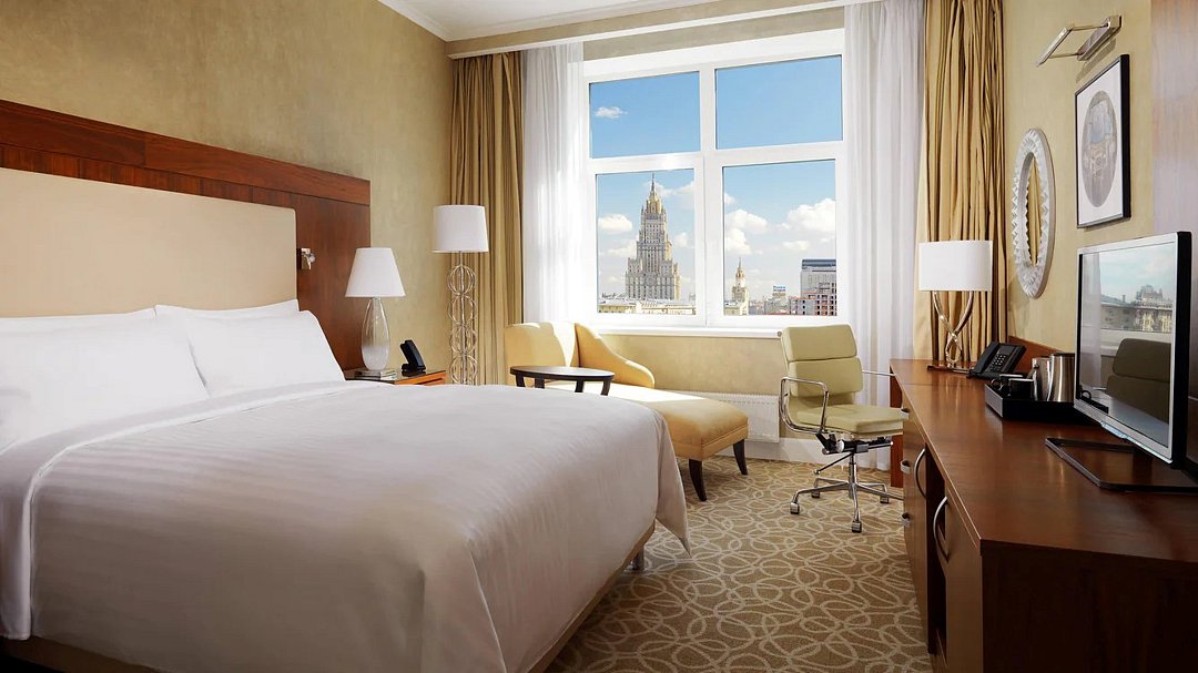 спутниковое телевидение, Wi-Fi, телефон, кондиционер, светильник, фен, будильник, электронные замки, кофемашина, утюг, радио, ванная комната, халаты, тапочки, гигиенические средства, косметические средства, кровать «King size», сейф, питьевая вода, вид на город, телевизор с плоским экраном, мини-холодильник, неограниченное посещение СПА, фитнес-зона, можно с питомцамиВ гостиничном номере