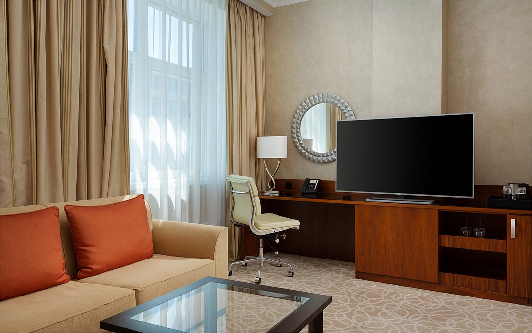 спутниковое телевидение, кабельное телевидение, Wi-Fi, телефон, кондиционер, фен, будильник, электронные замки, кофемашина, утюг, радио, ванная комната, халаты, тапочки, гигиенические средства, косметические средства, кровать «King size», диван, кресла, журнальный столик, багажная тумба, зеркало, чайный набор, косметическое зеркало, питьевая вода, гостиная зона, вид на город, кресло, вид во двор, диван-кровать, телевизор с плоским экраном, мини-холодильник, шкаф-купе, рабочий стол, неограниченное посещение СПА, фитнес-зона, можно с питомцамиВ гостиничном номере