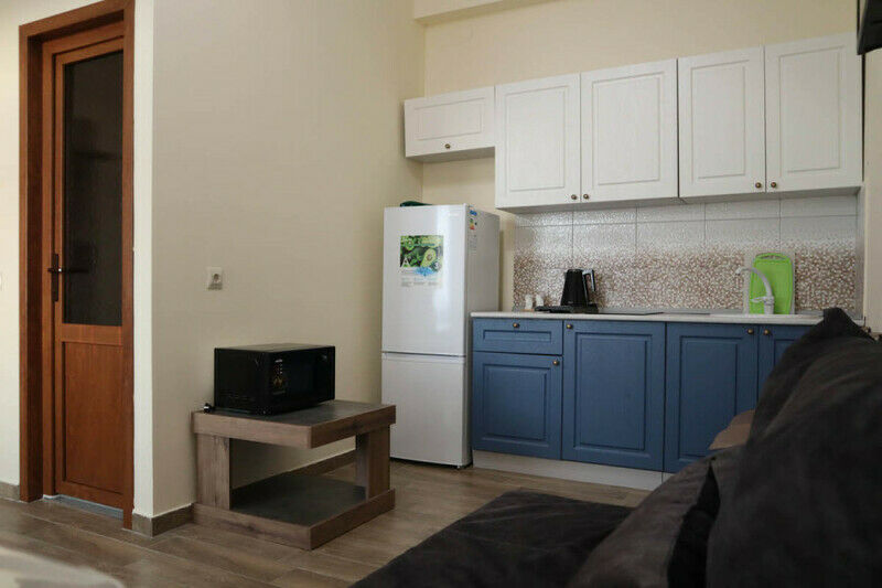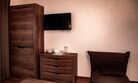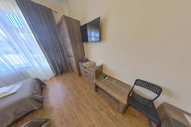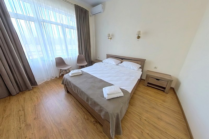 Удобства в номере: одна двуспальная большая кровать, постельное белье, сплит система, холодильник, шкаф, комод, тумбочки прикроватные, стулья, набор посуды, чайник электрический, электронные замки, балкон, санузел, гигиенические наборы, махровые халаты, полотенца, фен, жк телевизор, цифровое телевидение.