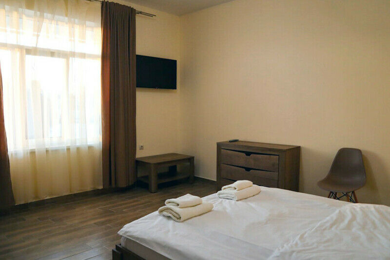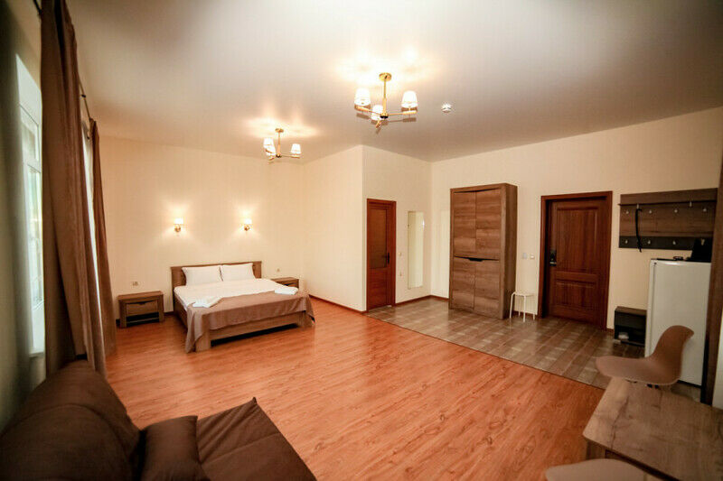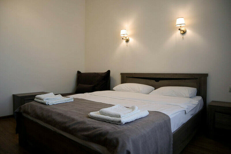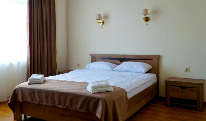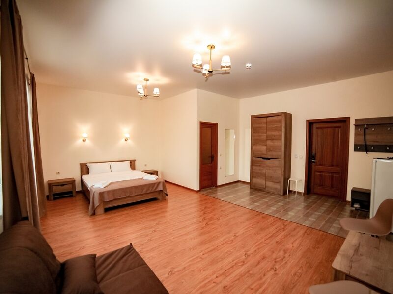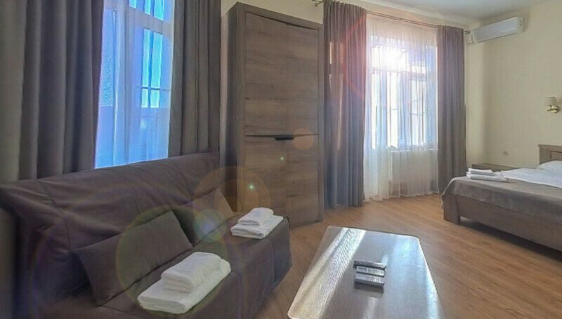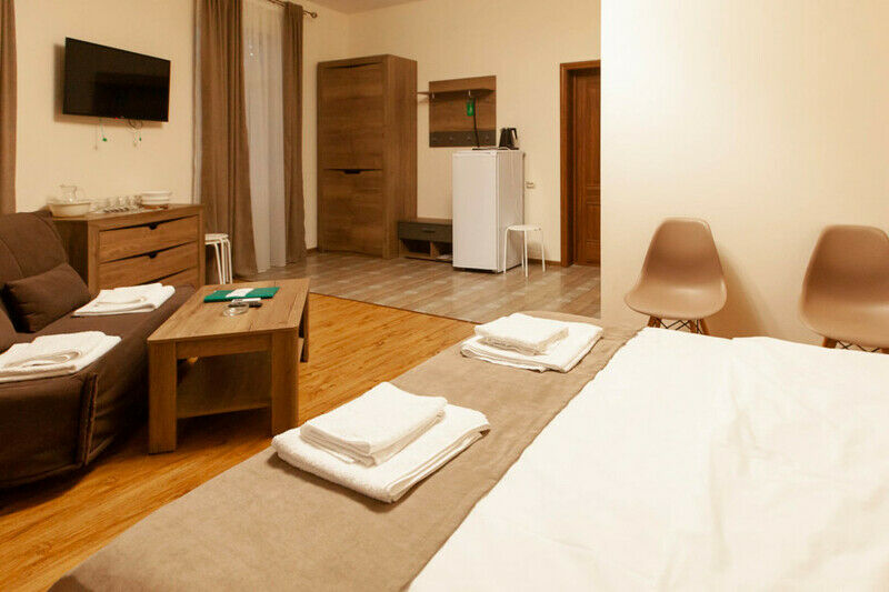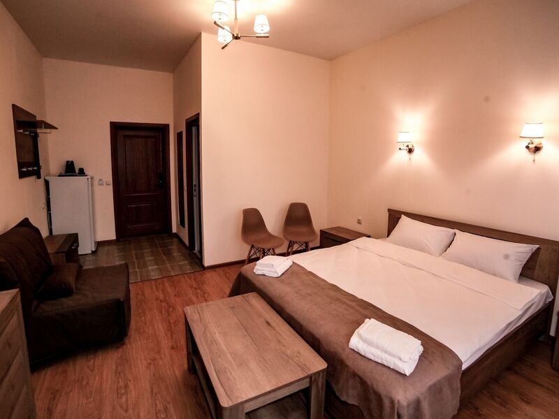 Удобства в номере: одна двухспальная кровать, диван (раскладной), постельное белье, сплит система, холодильник, шкаф, комод, тумбочки прикроватные, стулья, набор посуды, чайник электрический, электронные замки, балкон, санузел, гигиенические наборы, махровые халаты, полотенца, фен, жк телевизор, цифровое телевидение.