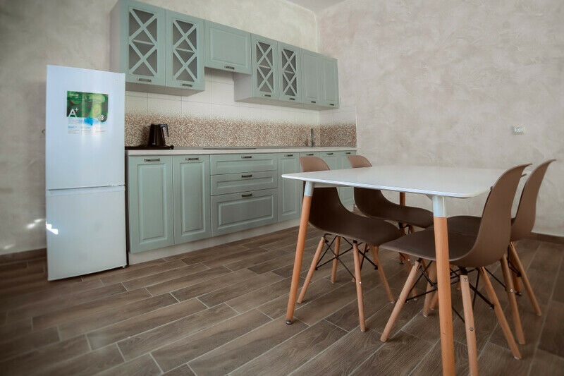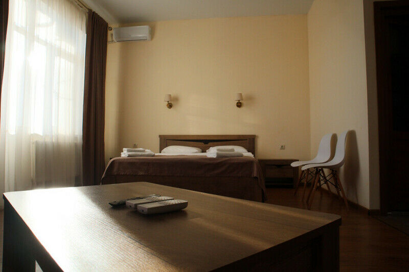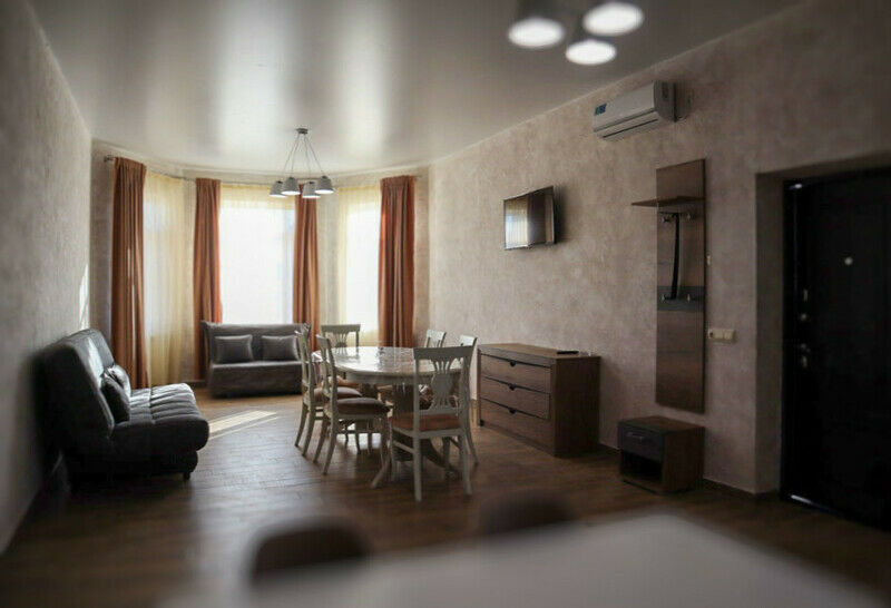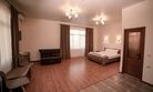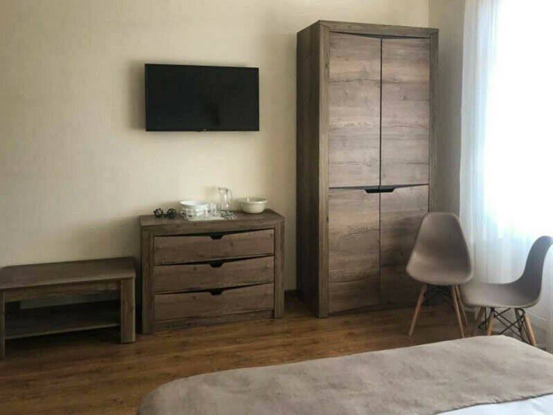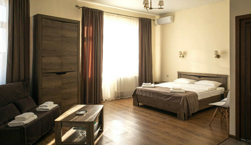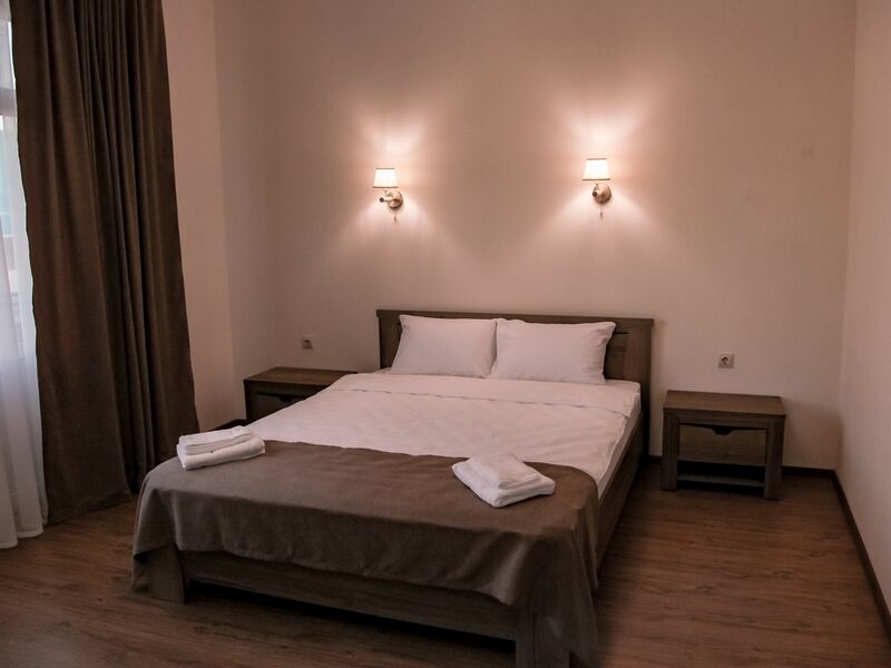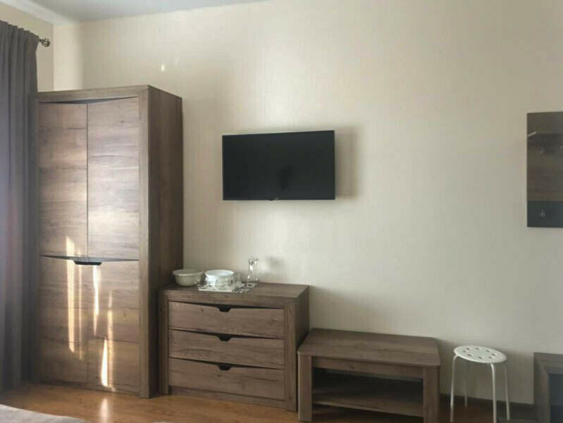 Удобства в номере: одна двухспальная кровать, диван (раскладной), постельное белье, сплит система, холодильник, шкаф, комод, тумбочки прикроватные, стулья, набор посуды, чайник электрический, электронные замки, балкон, санузел, гигиенические наборы, махровые халаты, полотенца, фен, жк телевизор, цифровое телевидение.