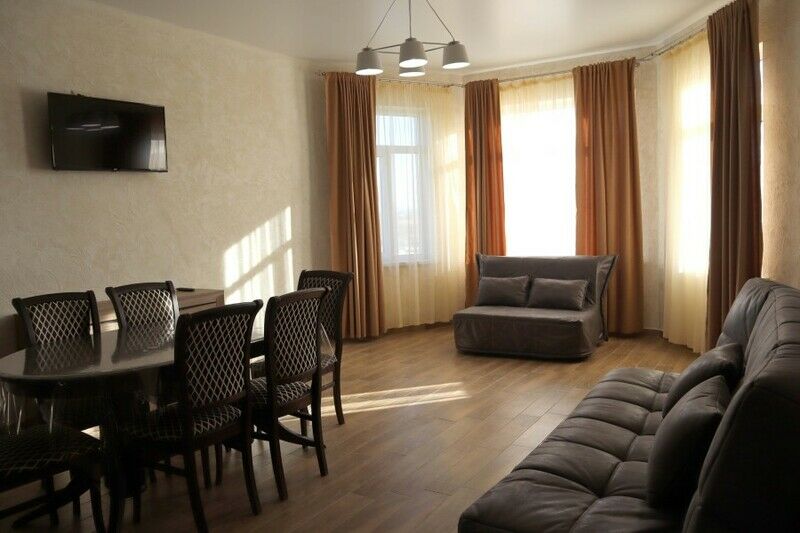 В гостиной имеется 2 дивана, большой обеденный стол.