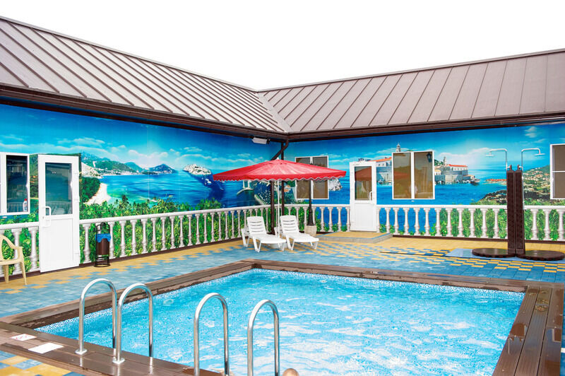 На территории два бассейна с термальной водой. Малый бассейн глубиной 0,8м., в большом 1,35-1,55м. Работают гидро-, аэромассажи, водопады, гейзеры. В вечернее время работают софиты(цветотерапия) и музыка релакс. Температура воды 38-39 градусов. Вода в бассейне всегда чистая, работает современная система очистки воды. В холодное время вход в бассейн можно осуществлять из помещения (через аквариум).