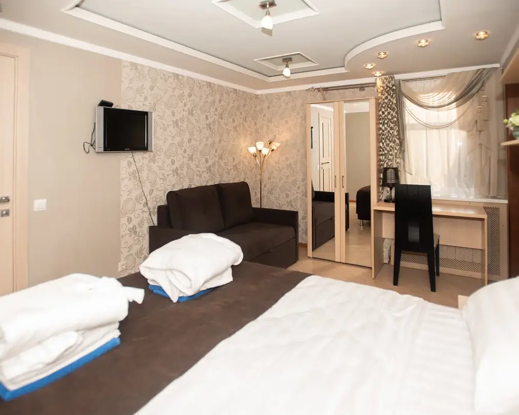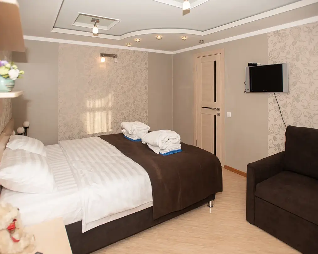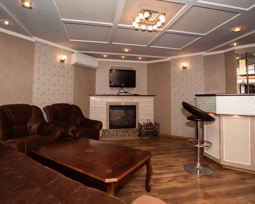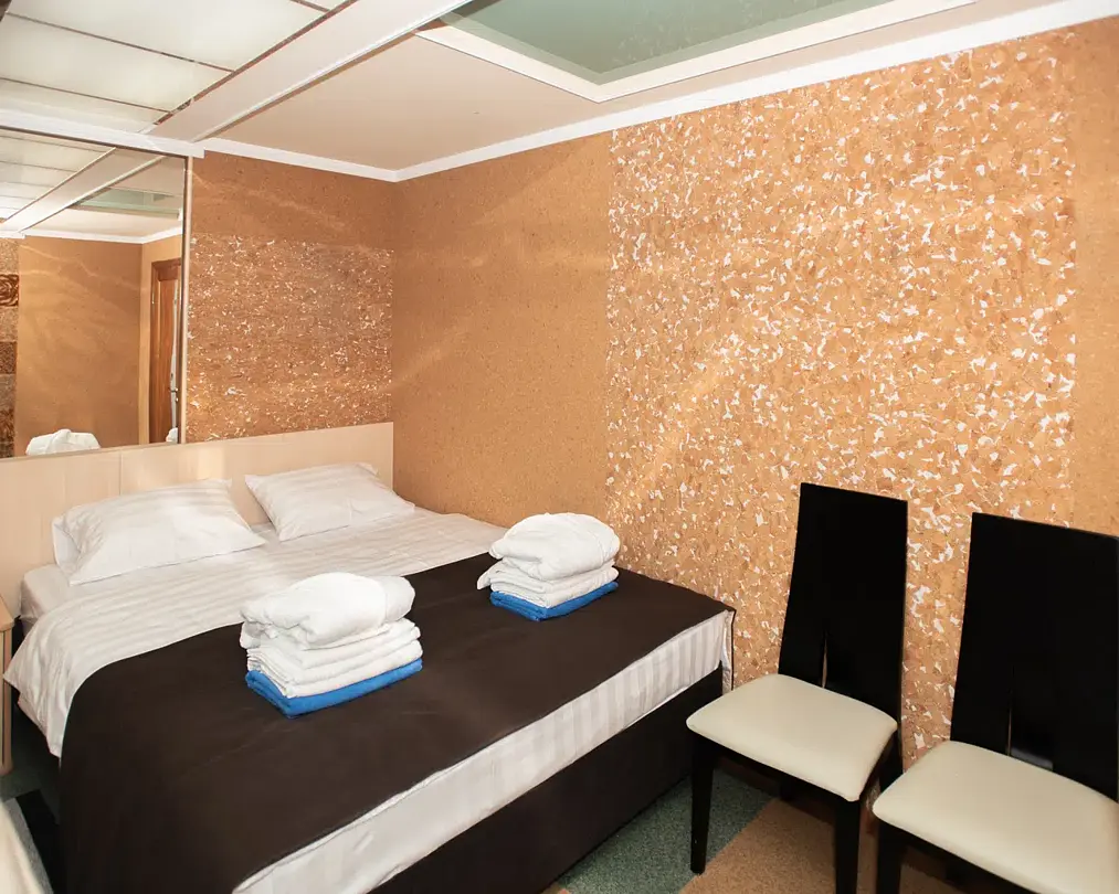Двухкомнатные апартаменты - это номер с доступом в термальный бассейн, мангальной зоной. Рассчитан на 4 взрослых и одного ребенка. В вашем распоряжении 2 отдельные комнаты с двуспальными еврокроватями, кухня отдельно от номера, каминная рядом с бассейном в личном пользовании с раскладным диваном, с барной стойкой. В стоимость входит: купание в термальном бассейне, тапочки, 4 вида полотенец, халаты, зуб. наборы, гигиенические принадлежности.Услуги и удобства