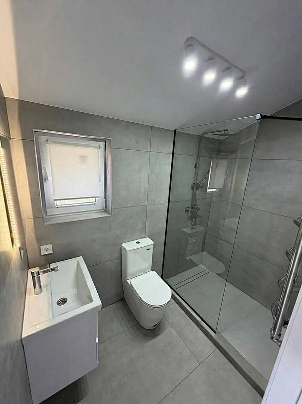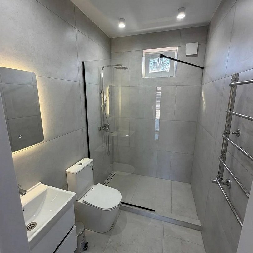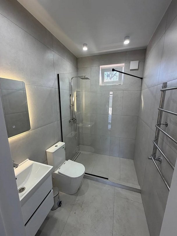 Индивидуальная ванная комната: душ, раковина, туалет.