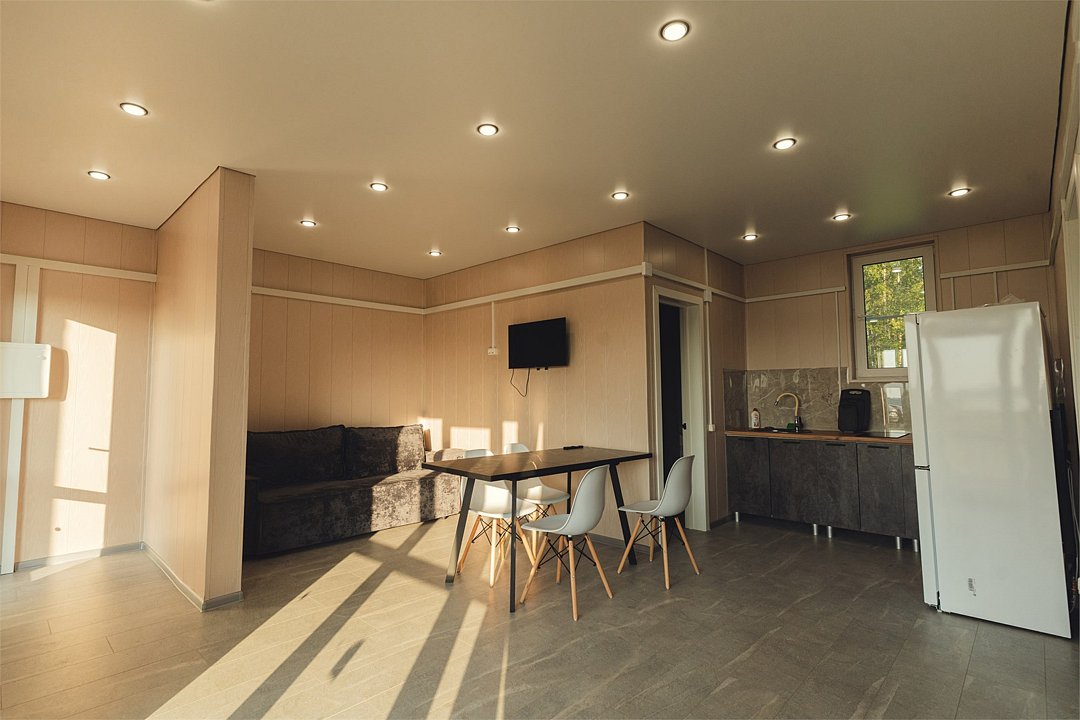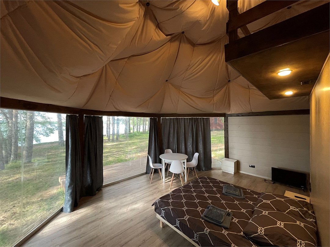 Небольшой круглый дом хорошо сохраняют тепло за счет своей изоляции. Интересен такой глэмпинг индивидуальным дизайном: панорамные окна позволяют любоваться первозданной природой. В них возможно сезонное проживание. Располагается собственная терраса с мангальной зоной. Внутри дома есть все необходимое для комфорта: модульный санузел, отопление (теплый пол), электричество, мебель, современная кухня, посуда, телевизор. Вместимость от 2 до 4 гостей.Услуги и удобства