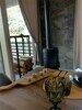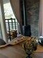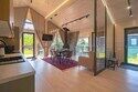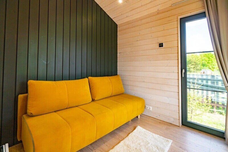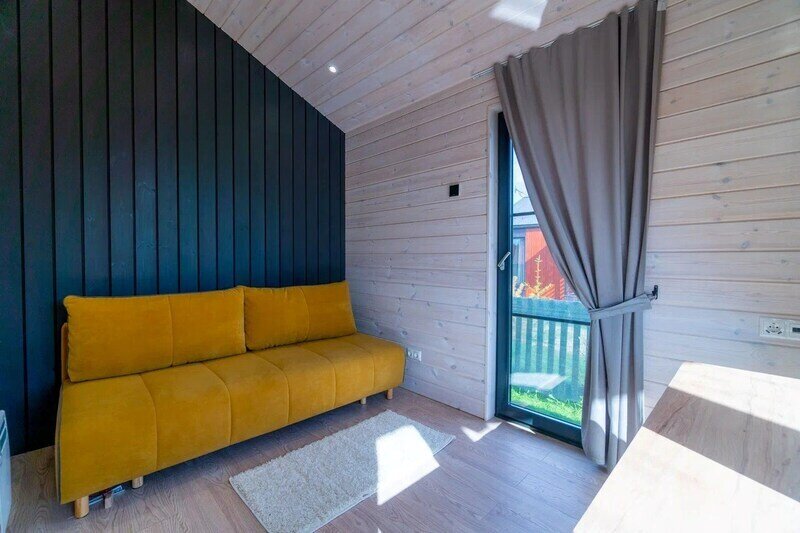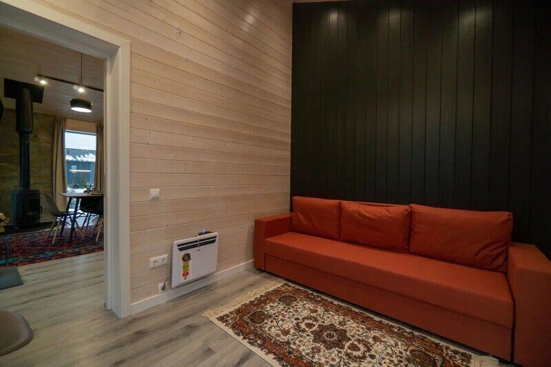 - просторная кухня-гостиная с дровяным камином, раскладным диваном и современным ТВ;