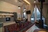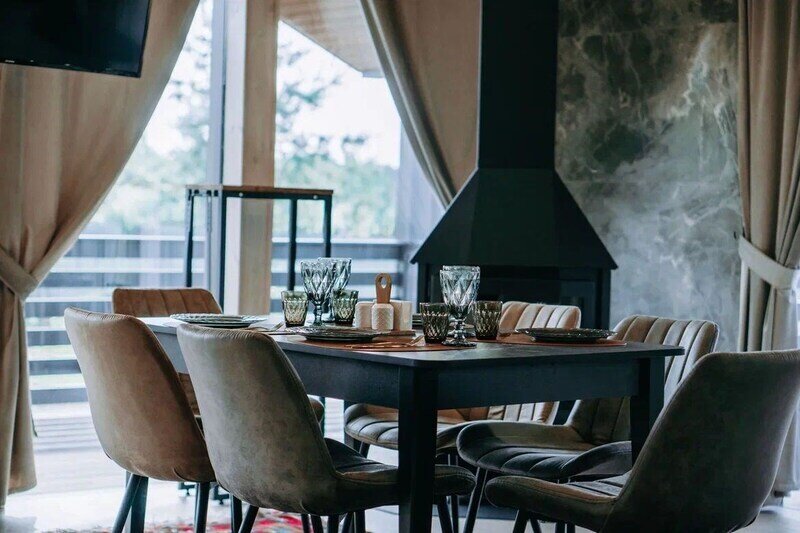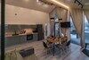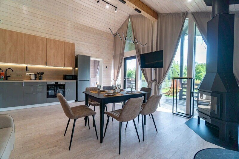 - просторная кухня-гостиная с дровяным камином, раскладным диваном и современным ТВ