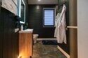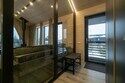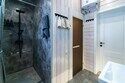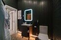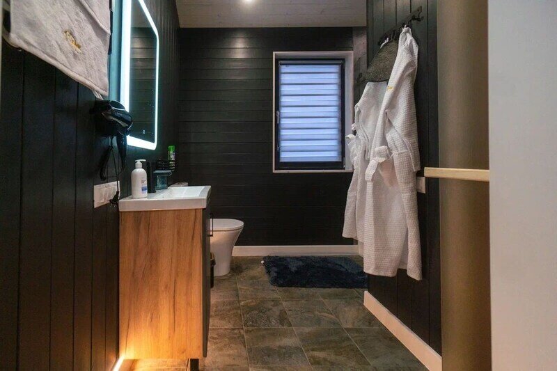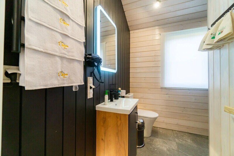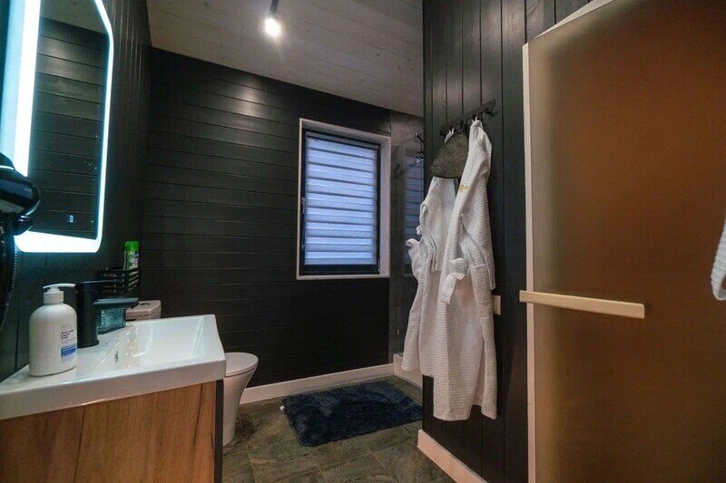 - санузел с теплым полом, душевой кабиной, унитазом, раковиной, феном и зеркалом с подсветкой;