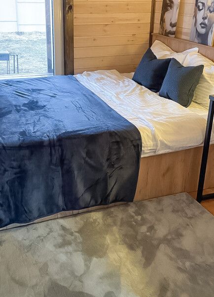Сам коттедж представляет собой комфортабельный одноэтажный дом с двумя спальнями. Просторная гостиная с уютным камином станет идеальным местом для отдыха и общения. Для вашего удобства предусмотрены современная душевая кабина.