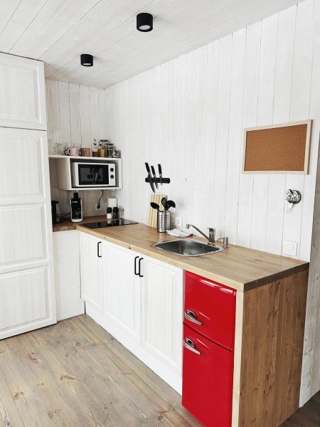 Дом с террасой и зоной барбекю. На первом этаже расположены: кухня-гостиная с раскладным диваном, камином, телевизором, высокоскоростным интернетом и полностью оборудованной кухней; совмещённый санузел с душем. На мансардном этаже располагается спальня с двуспальной кроватью.