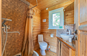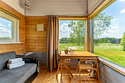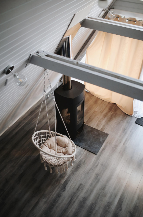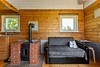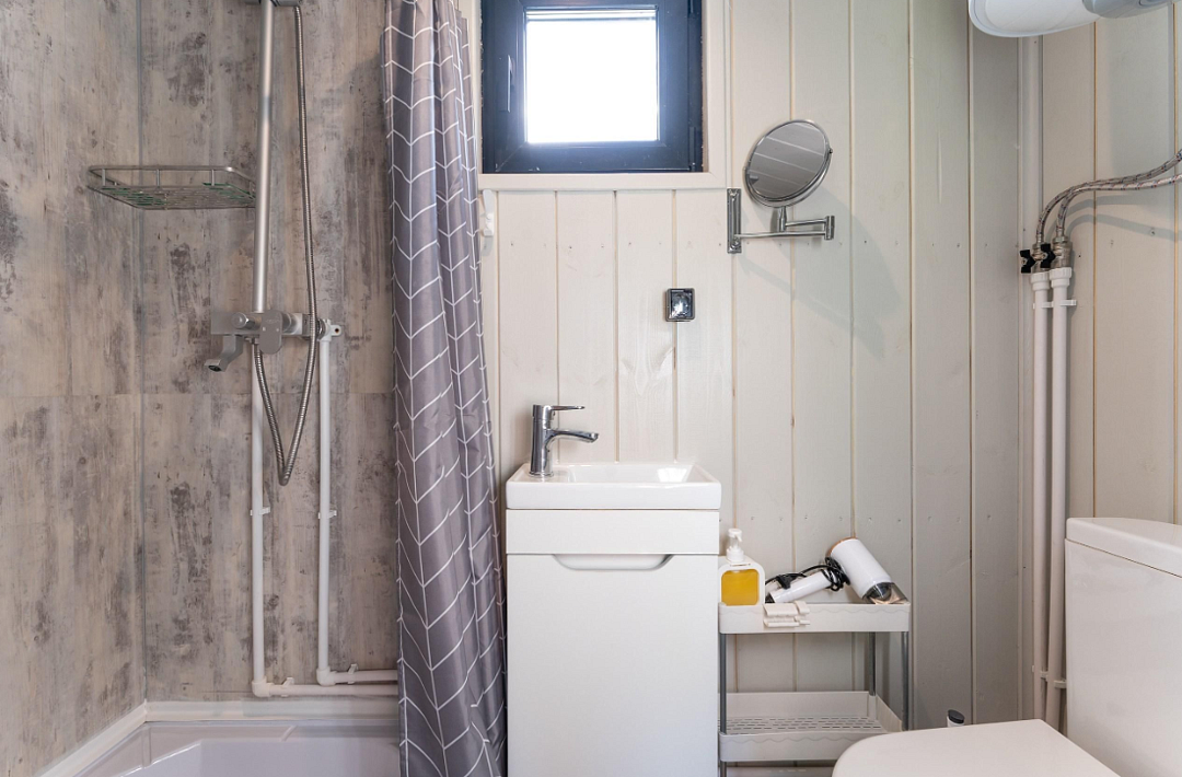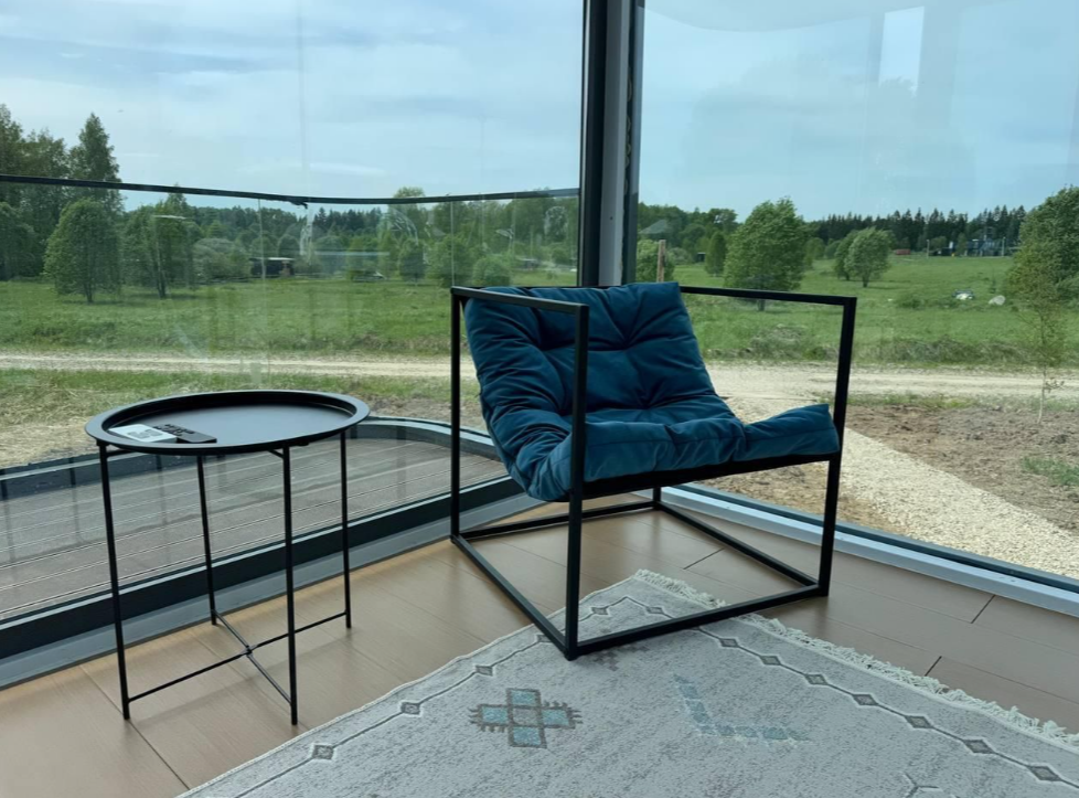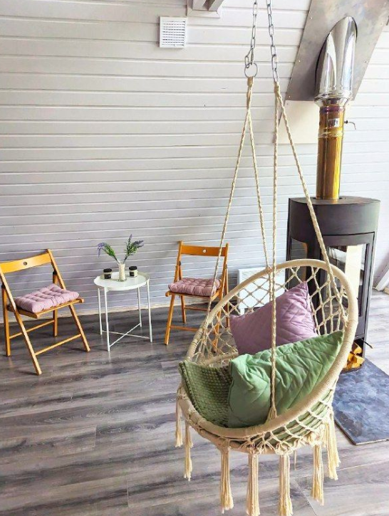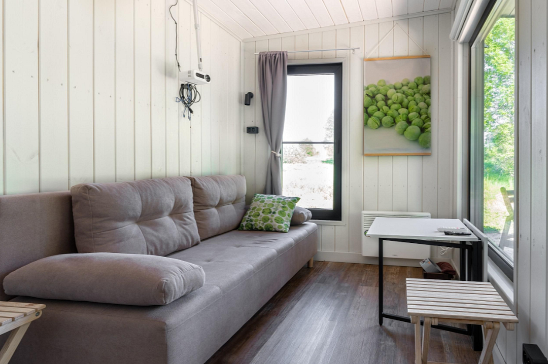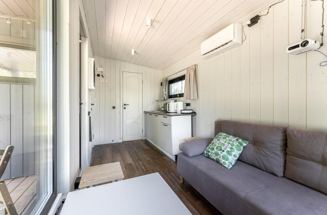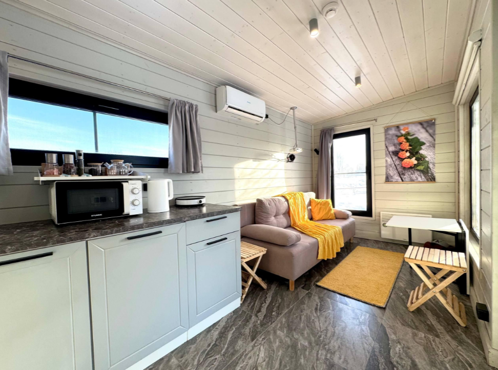 Гостиная зона располагает камином, мягким диваном, журнальным столиком, креслом-качалкой и парой стульев. В целях полного погружения в природу телевизор в домиках отсутствует, но стабильный Wi-Fi всегда к услугам гостей. Кондиционер с функциями охлаждения и обогрева, а также возможность управления теплым полом посредством «Алисы» и наличие дополнительных обогревателей обеспечивают комфортный микроклимат.