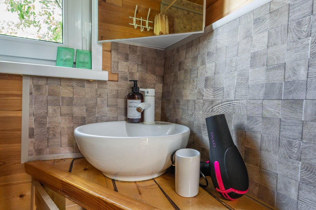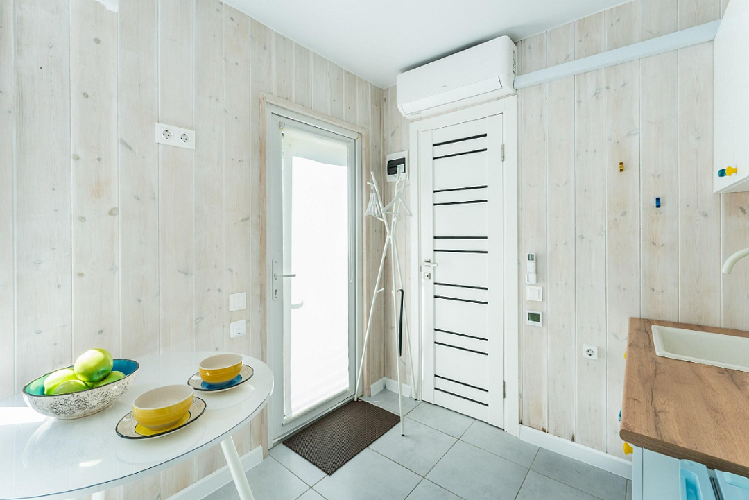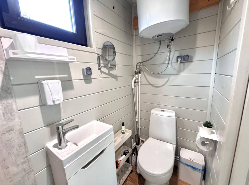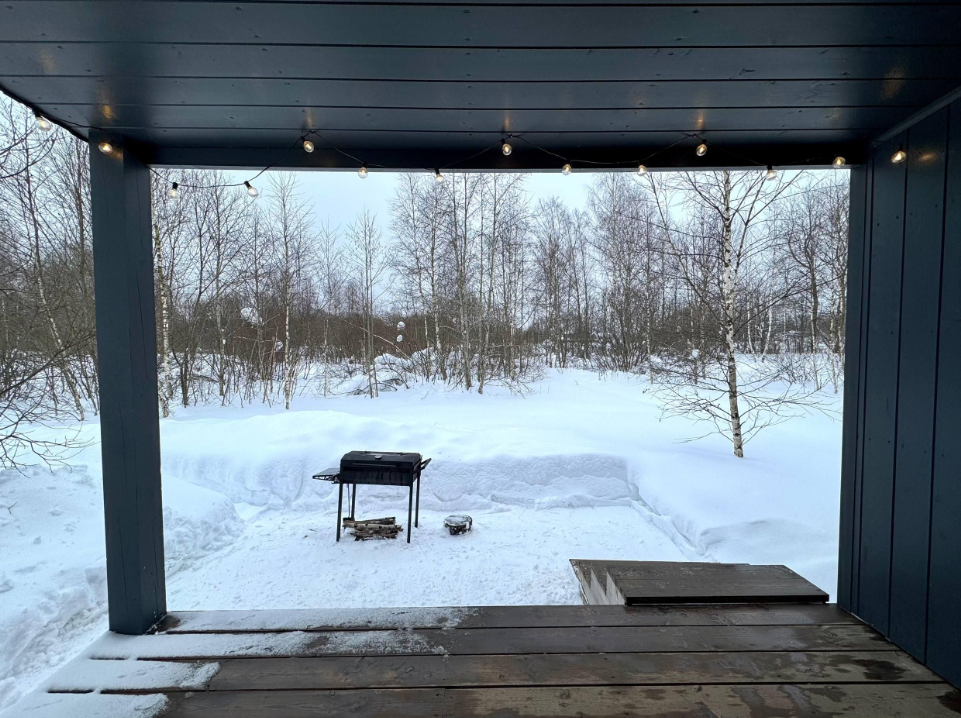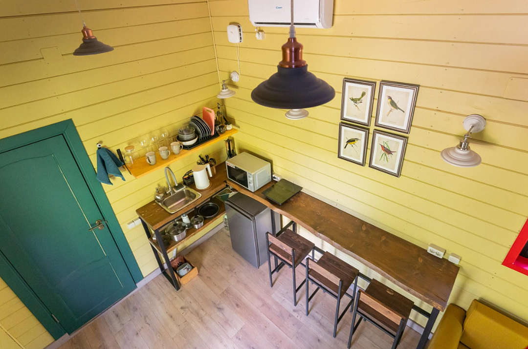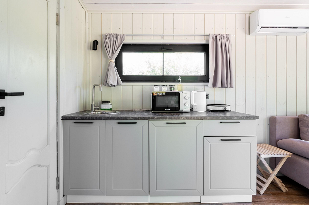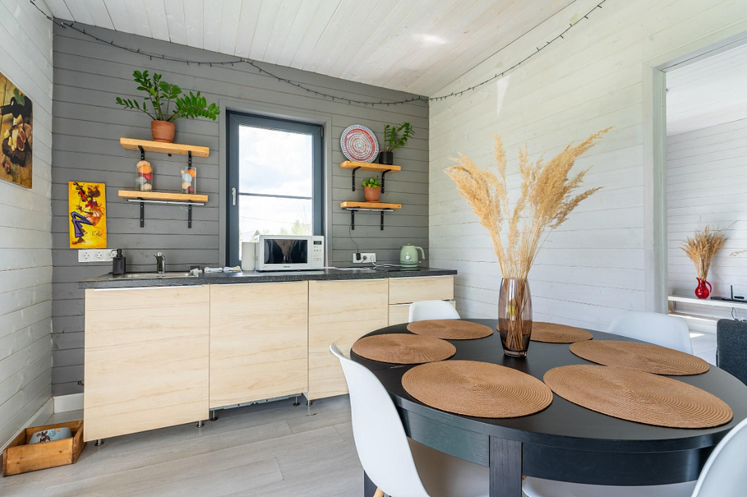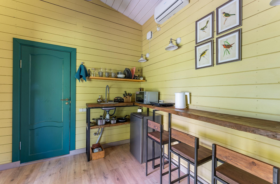 В доме — две отдельные комнаты, полноценная кухня со всем необходимым, включая рабочую зону. Дом рассчитан на комфортное проживание до 6 гостей. Есть Wi-Fi, настольные игры и кондиционер, отопление работает круглый год.