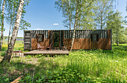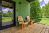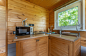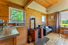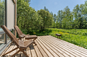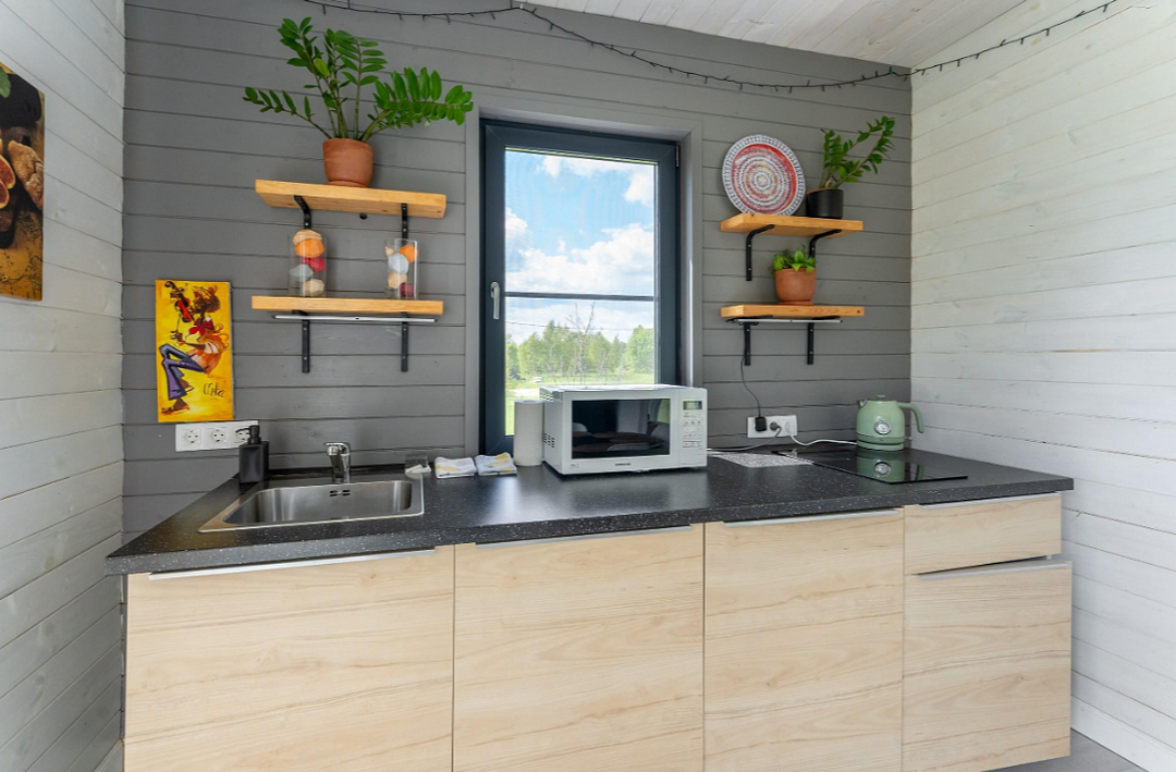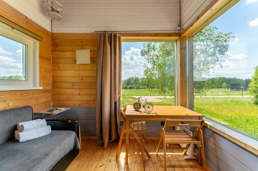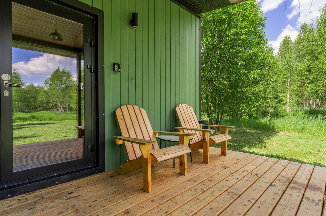 В доме: полностью оборудованная кухня, спальная зона, терраса для отдыха с видом на лес.