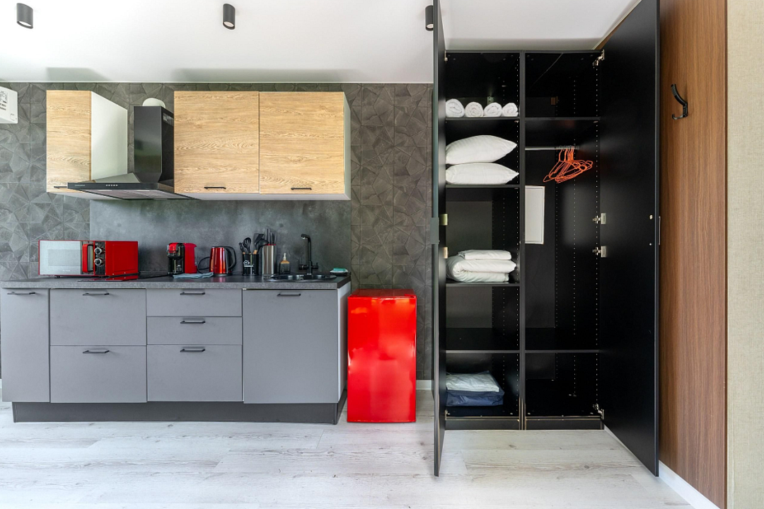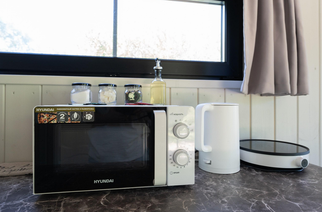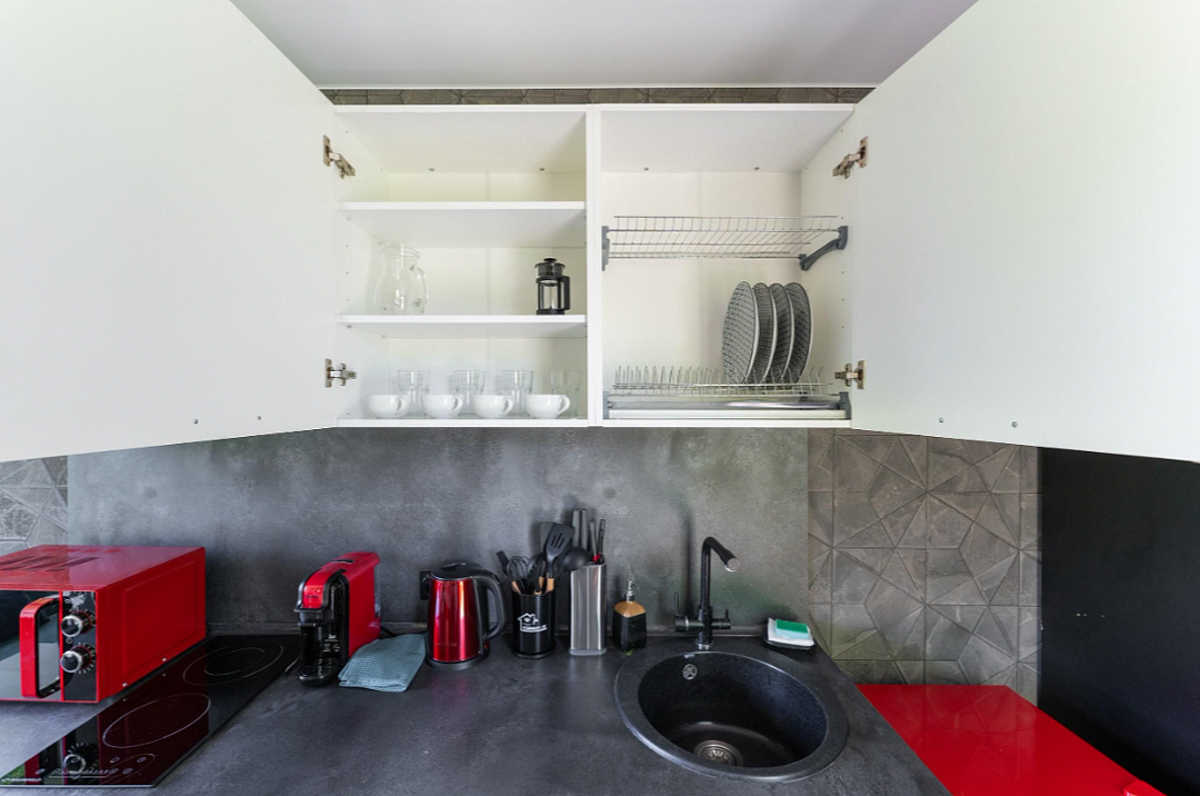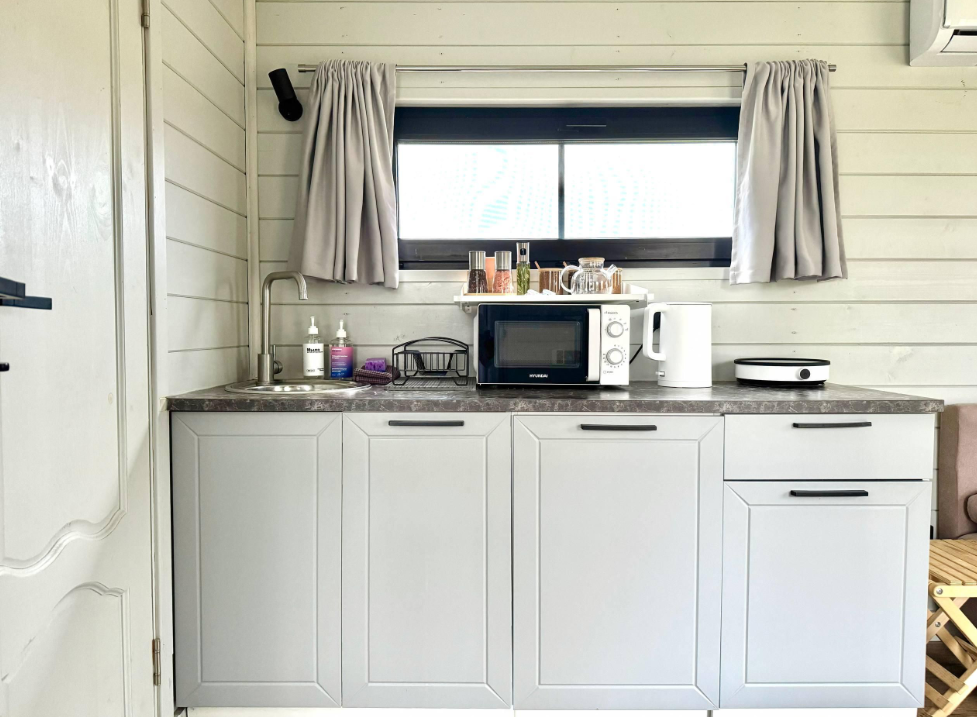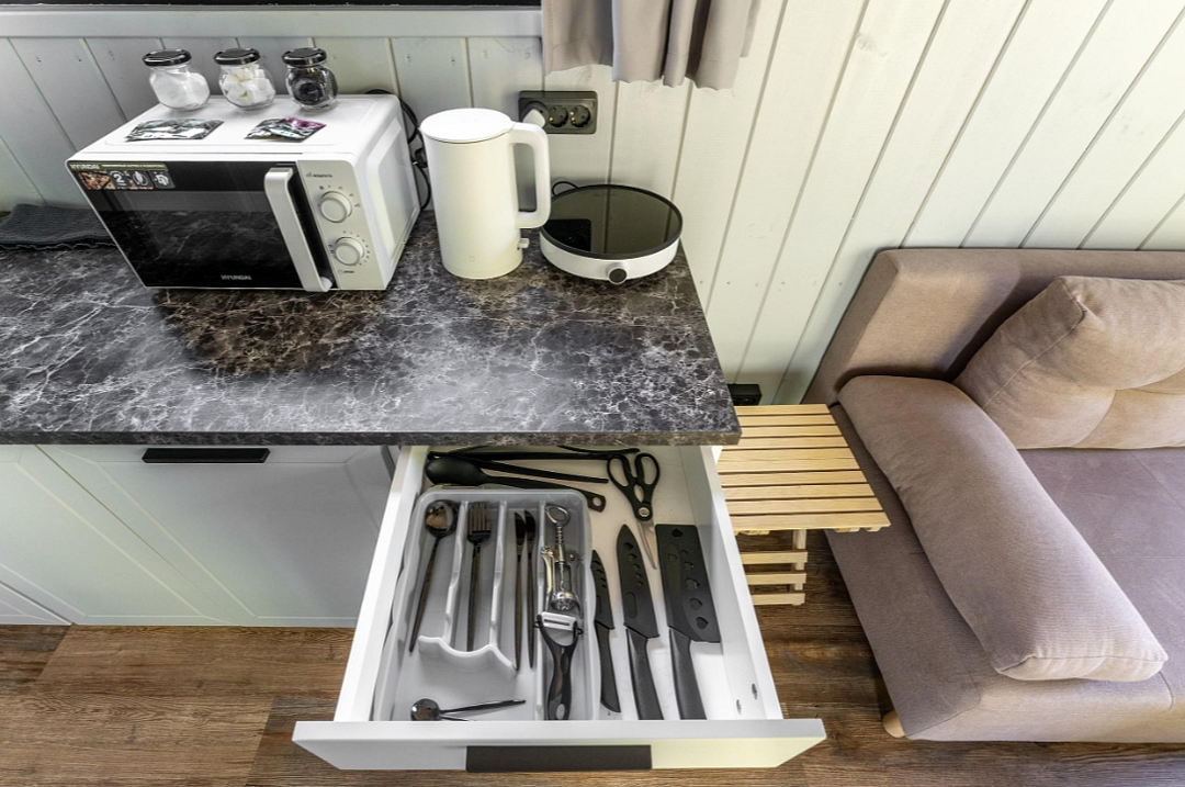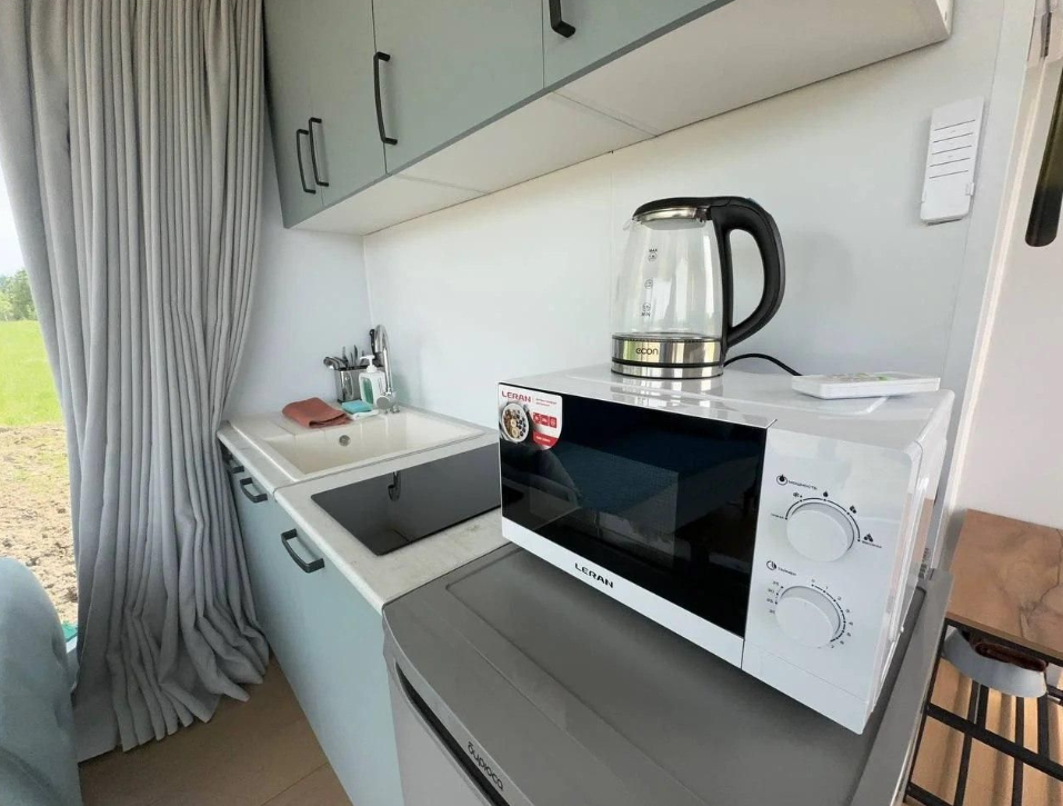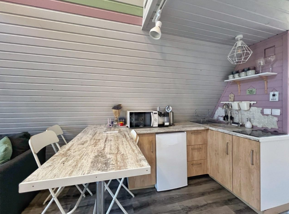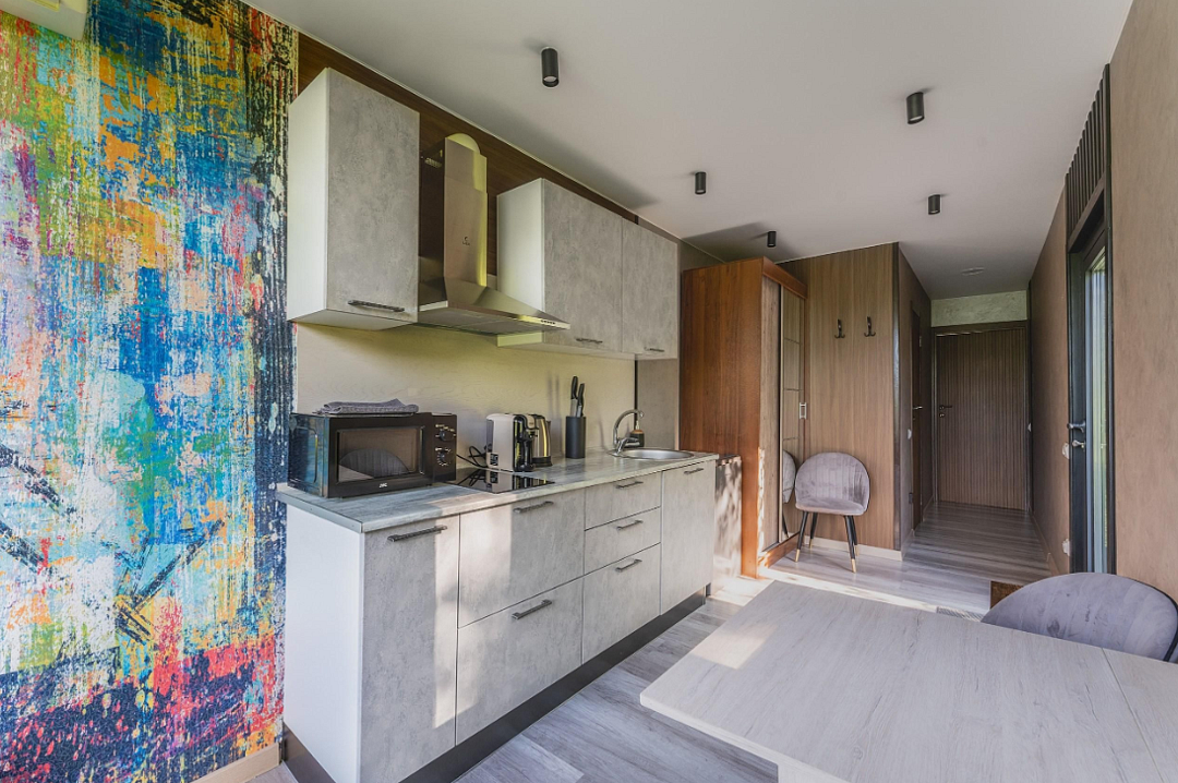 - полностью оборудованная кухня (микроволновая печь, индукционная плита, электрочайник, холодильник);